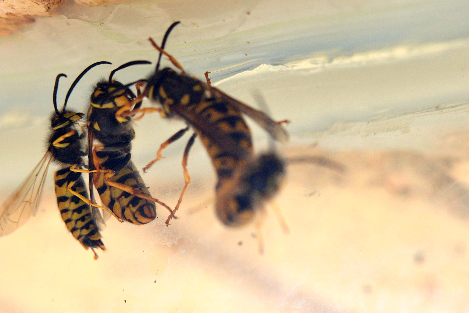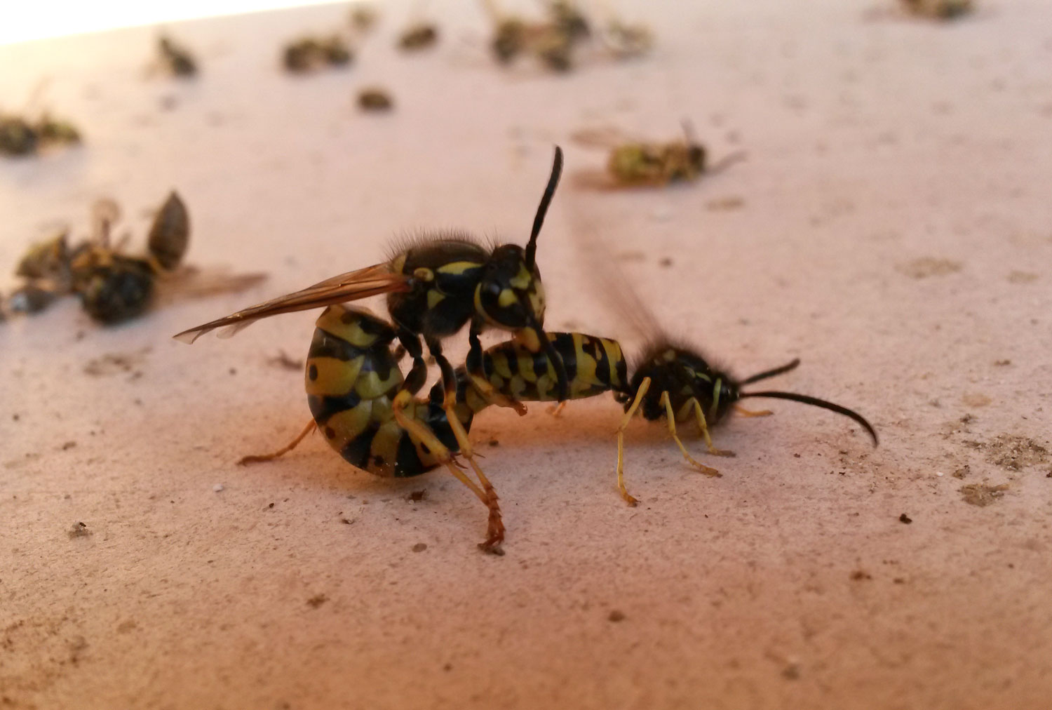 Nos encontramos con el espectáculo de la cópula entre zánganos y reinas. Aproveché un momento para tomar unas fotografías y observar cómo se produce el acoplamiento. El macho se abalanza sobre la hembra. Parece que no discrimina y lo hace sobre cualquier hembra. Y tantas veces como sea necesario. Si la hembra está receptiva permite que el macho se agarre a su espalda. En caso contrario, se agita fuertemente y se lo saca de encima. El macho que ha conseguido asirse sobre la hembra, saca sus genitales situados en el extremo del abdomen e intenta coger los de la hembra. No es una tarea fácil. Tarda en cogerlos. Sus genitales son como una especie de embudo que se intenta acoplar y cerrarse sobre los de la hembra. Entonces se produce la transferencia de esperma que puede durar varios minutos. Tras ello la hembra forcejea y se desengancha. A partir de entonces el macho carece de utilidad. Lo que no sé es, si como en el caso de las hormigas, una hembra puede copular con varios machos para hacer acopio de la máxima cantidad de esperma.