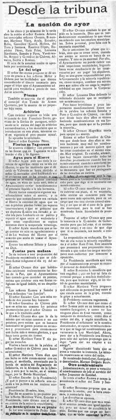 Y para acabar, en el mismo periódico aparece el 24 de julio de 1919 la noticia de que se nombra a Manuel Delgado Baute como desinfector, fumigador y desratizador (figura 6). Una elección que va precedida por la polémica de los excesivos nombramientos que el consistorio de Tenerife estaba llevando a cabo. Por tanto, tenemos los nombres y apellidos de cinco personas que ejercieron el oficio de control de múridos. Los más antiguos de los que yo tenga constancia.