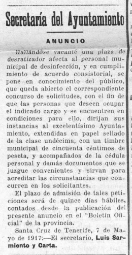 El primer recorte (figura 1) es del 14 de mayo de 1917. Se puede leer un anuncio de la Secretaría del Ayuntamiento de Tenerife en el que se informa de que hay vacante para una plaza de desratizador y se abre un concurso de solicitud de contratación. Se explica cómo los candidatos han de presentar las peticiones y se da un plazo de admisión de 15 días hábiles a partir de la publicación del anuncio.