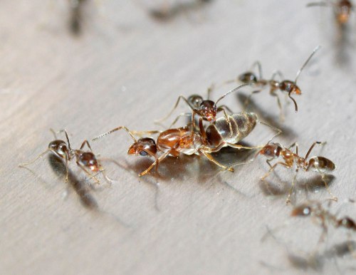 Los geles funcionan porque esta hormiga tiene un buche antes del estómago que es conocido como estómago social. El 90% de lo que entra en el hormiguero es líquido transportado en este buche. Así que si el cebo que les ofrecemos es ingerido por las obreras, cada obrera podrá alimentar a otras obreras, reinas y larvas (trofalaxia). Es muy interesante para el control de hormigas saber hasta cuántas obreras puede alimentar una obrera que lleve comida en su buche. Este dato sería muy interesante que lo tuviéramos quienes nos dedicamos al control de plagas. Pero, ¿por qué no lo sabemos? Pues me da que por el oscurantismo de los fabricantes, porque bien se hacen estudios de eficacia al respecto. Estaría bien que alguna vez nos dieran datos objetivos y dejaran de ofrecernos fabulosas gráficas de eficacia diciendo que su producto es fabuloso.