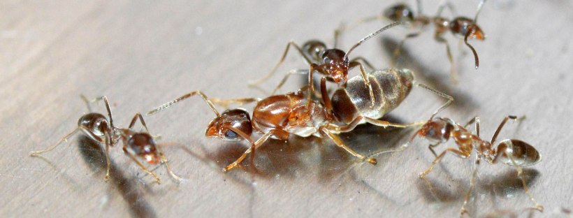 Los geles funcionan porque esta hormiga tiene un buche antes del estómago que es conocido como estómago social. El 90% de lo que entra en el hormiguero es líquido transportado en este buche. Así que si el cebo que les ofrecemos es ingerido por las obreras, cada obrera podrá alimentar a otras obreras, reinas y larvas (trofalaxia). Es muy interesante para el control de hormigas saber hasta cuántas obreras puede alimentar una obrera que lleve comida en su buche. Este dato sería muy interesante que lo tuviéramos quienes nos dedicamos al control de plagas. Pero, ¿por qué no lo sabemos? Pues me da que por el oscurantismo de los fabricantes, porque bien se hacen estudios de eficacia al respecto. Estaría bien que alguna vez nos dieran datos objetivos y dejaran de ofrecernos fabulosas gráficas de eficacia diciendo que su producto es fabuloso.
