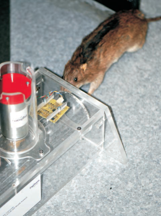 El camino emprendido por el proyecto Pied Piper para utilizar de nuevo el colecalciferol es bien viable. Y más si tenemos en cuenta que su uso no sería mediante la formulación de un cebo para ser ingerido. Se propuso desde el inicio la aplicación tópica del colecalciferol mediante una aerosol. Pero no para que luego el producto aplicado penetrara en la rata mediante la ingesta por acicalamiento, sino para que penetrara absorbida a través de la piel [3]. Lo primero que hicieron fue desarrollar una producto que permitiera que el colecalciferol penetrara en el animal por vía dérmica. Luego lo formularon para ser aplicado mediante un aerosol. Y en último lugar, desarrollaron un dispositivo que utilizara este aerosol y rociara a la rata con la dosis justa. En la imagen número tres, se puede ver el primer dispositivo de metacrilato desarrollado para realizar pruebas. Esta novedosa manera de aplicar el colealciferol como rodenticida tiene dos ventajas. La primera es que tan solo es necesaria una única dosis. La segunda es que se necesita menos materia activa de la que se utiliza para un cebo.