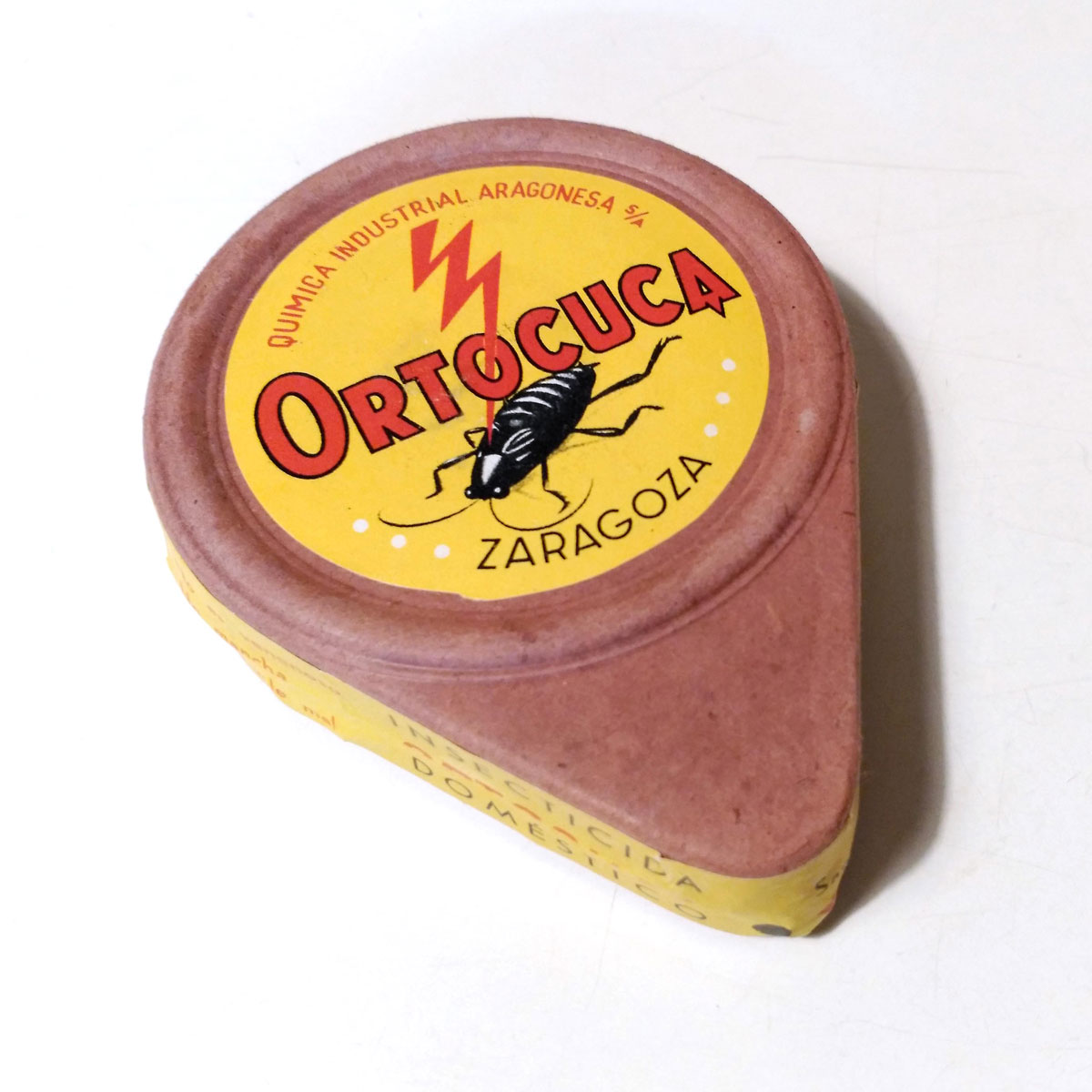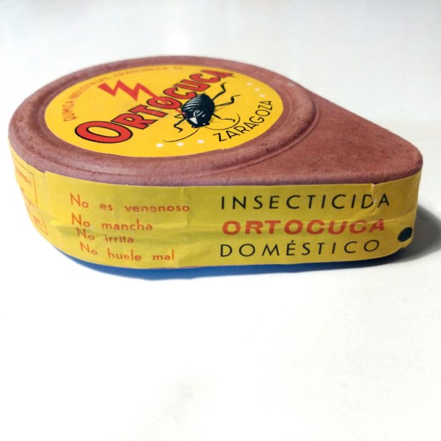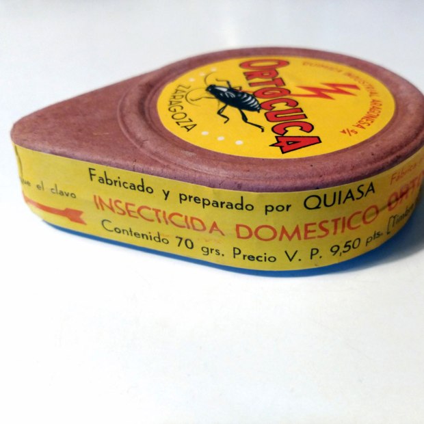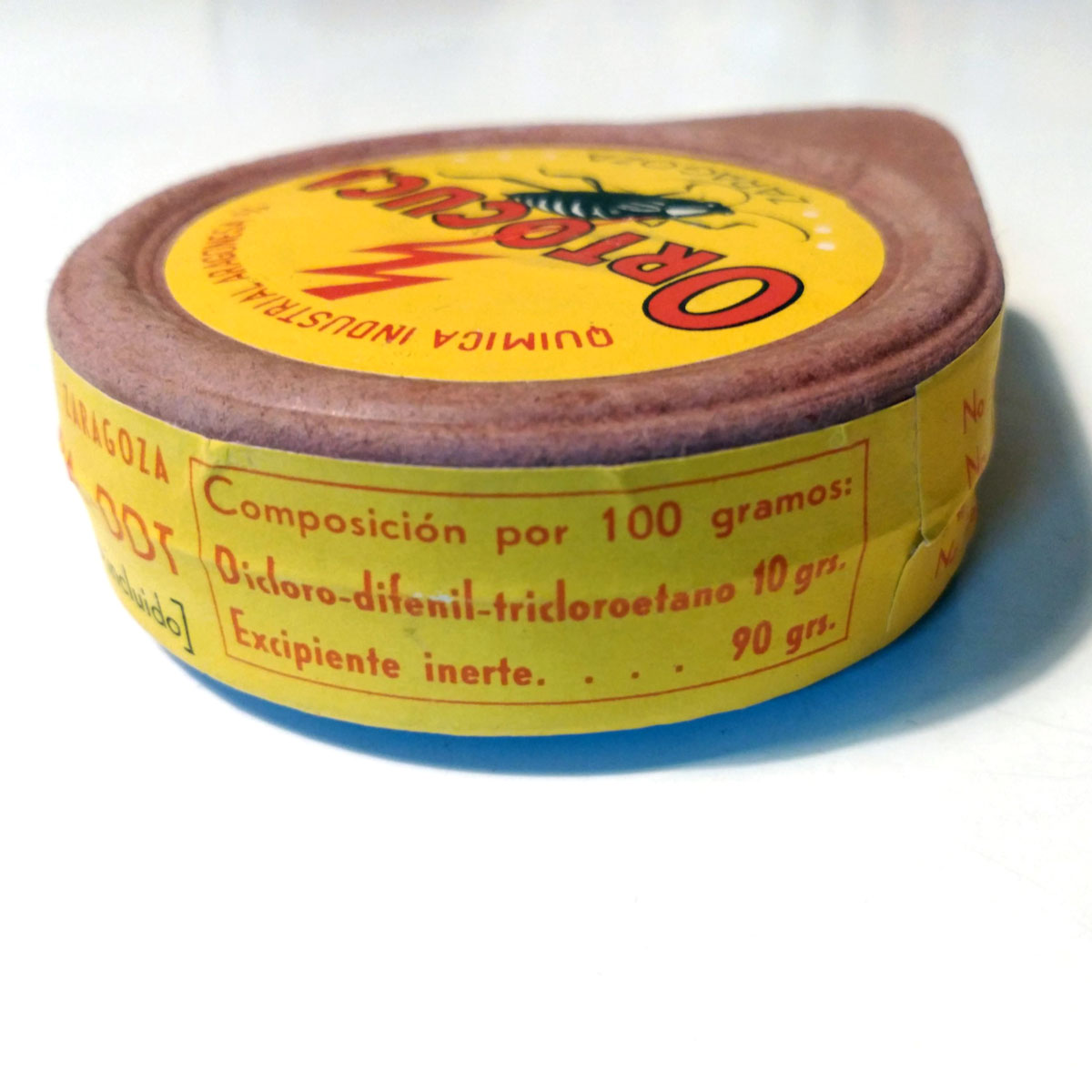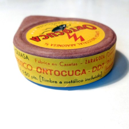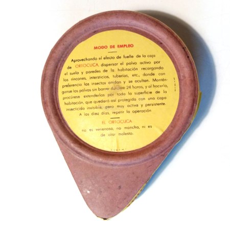 He adquirido una cajita fuelle para espolvoreo muy interesante. Desconocía esta marca de insecticida (Ortocuca), pero no a su fabricante (Química Industrial Aragonesa SA). Y es por ello que ahora tengo la cajita sobre mi mesa observándola al detalle. No es diferente de cualquier otro insecticida formulado en polvo de la época. Contiene dicloro-difenil-tricloroetano (DDT) al 10%. El contenido pesa 100 gramos, por tanto, 10 gramos de materia activa.