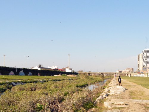 Sin embargo, cuando llega el otoño, las dos primeras especies migran hacia África. Mientras que el avión roquero permanece en la Península Ibérica, ya que es un ave sedentaria. Suelo observarla en el río Besós, a la altura de Santa Coloma de Gramanet. Durante los meses de invierno, se la puede ver haciendo acrobacias sobre el río dando caza a los escasos insectos voladores que hay en esta época. La suelo ver en pequeño número tanto en invierno como en verano. Es posible que, en la zona donde vivo, en esta época haya más ejemplares, porque parece ser que los que anidan en las montañas descienden hacia los valles y llanos, hacia zonas más templadas. En la imagen número 2, se puede ver el tramo final del río Francolí a su paso por Tarragona. Justo ayer estuve paseando junto a su cauce y pude observar aviones roqueros.