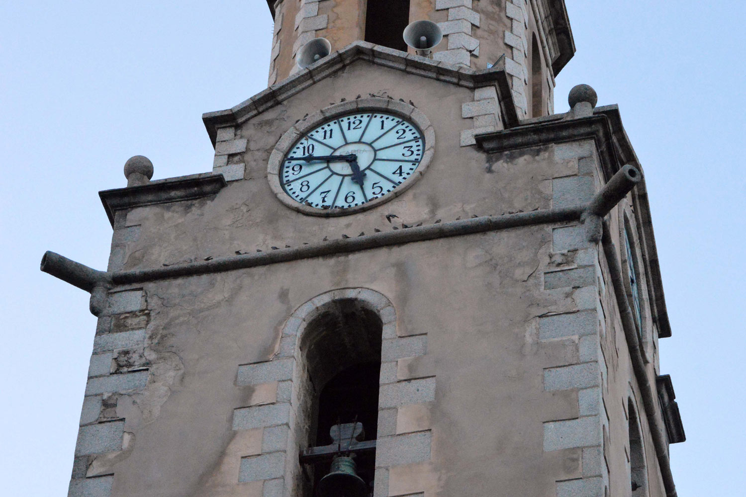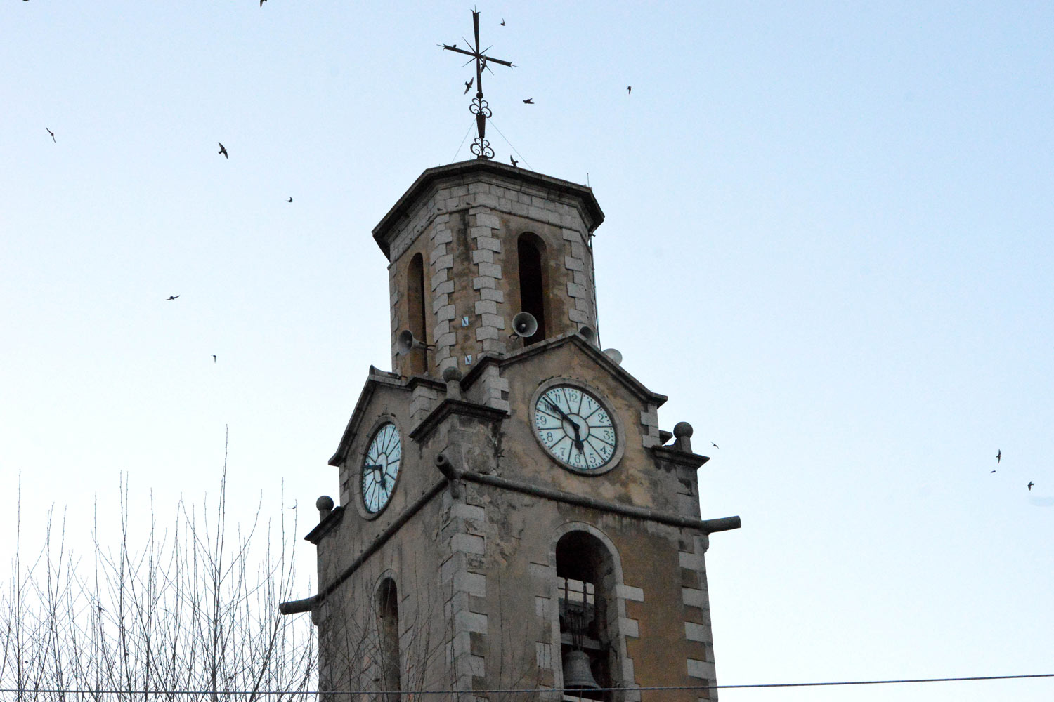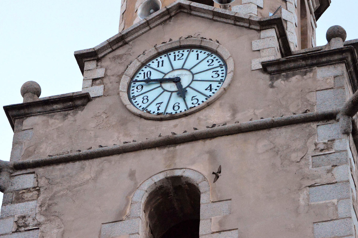 Fig 9. Avión roquero (Ptyonoprogne rupestris) en el campanario de la iglesia parroquial de Arbúcies (Girona)./ C. Pradera 03-2017