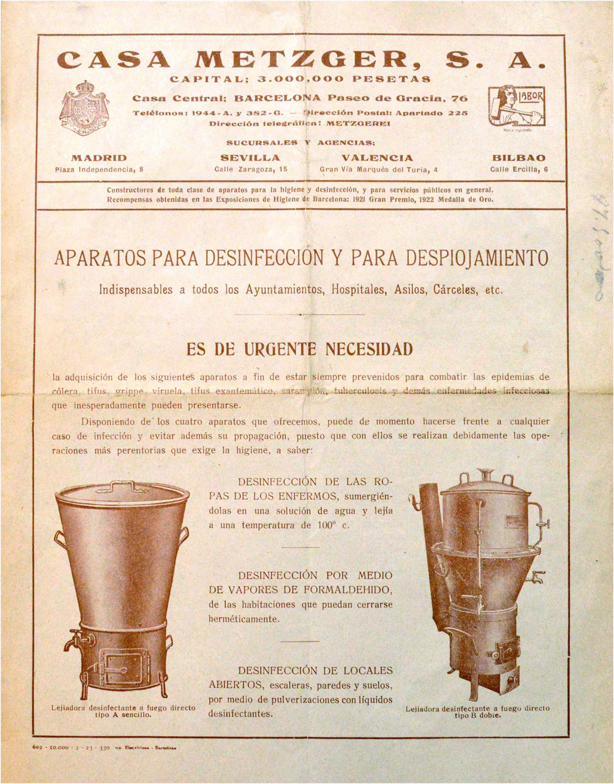 Ha caído en mis manos una hoja publicitaria de Casa Metzger SA de Barcelona. Lleva por tíulo ‘Aparatos para desinfección y para despiojamiento’. Se hace notar que son «indispensables a todos los Ayuntamientos, Hospitales, Asilos, Cárceles, etc.»