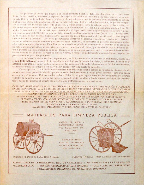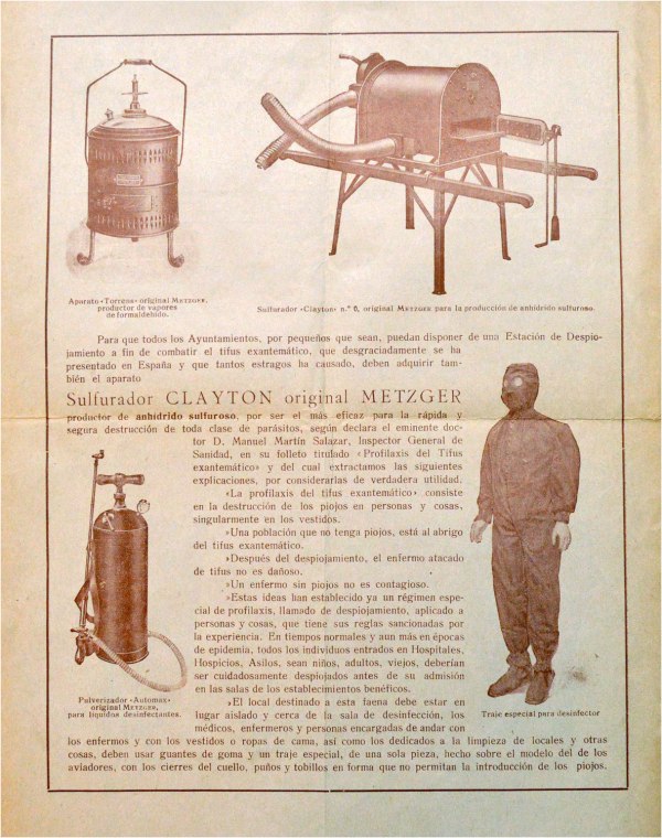 En las dos primeras páginas de esta hoja publicitaria se pueden ver los principales instrumentos utilizados para las desinfecciones en aquella época. Hay una lejiadora de tipo simple, una lejiadora de tipo doble, un formógeno de tipo Torrens, un sulfurador de tipo Clayton y un pulverizador. Y también, muy importante, se muestra un traje especial para el desinfector, es decir un equipo de protección individual. Es interesante constatar que gran parte del texto está dedicado a la defensa del anhídrido sulfuroso (SO2) por ser «el más eficaz para la rápida destrucción de toda clase de parásitos.» Y se transcribe parte del contenido de un folleto titulado ‘Profilzaxis del Tifus exantemático’ escrito por el doctor Manuel Martín Salazar, Inspector General de Sanidad. Esto me hace pensar que, cuando fue impresa esta hoja publicitaria, empezó a decaer el uso del dióxido de azufre al ser sustituido por el ácido cianhídrico [3].