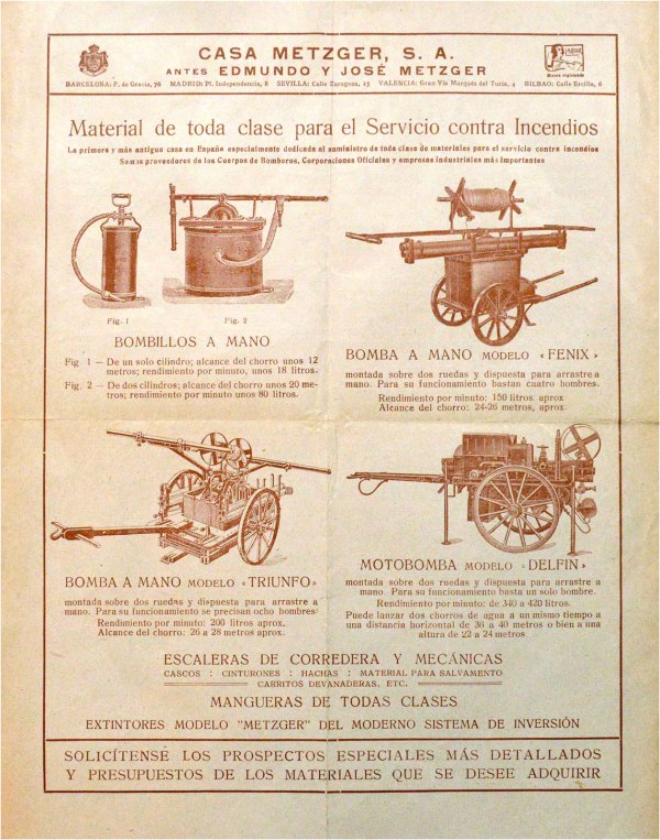 Además de material de desinfección, en esta hoja publicitaria se puede ver otro material como equipos para la limpieza y para el servicio contra incendios. De hecho, Casa Metzger fue una de las empresas más importantes de la época que fabricó y suministró material para extinguir incendios y equipos de protección para bomberos. Tengo muy poca información de esta casa, pero tenía unos extensos catálogos de bienes de equipo y suministros de toda clase. Fue fundada por los hermanos de origen judío José y Edmundo Metzger que provenían de Basilea (Suiza). Empezaron a principios de siglo XX en Barcelona como comerciantes representando a otras casas comerciales. Y gracias a su iniciativa acabaron como fabricantes creando la marca Labor para sus productos. No sabría determinar la importancia económica de estos industriales, pero todo apunta que fueron de los más destacados de la época. El presente catálogo debe de ser del año 1924 o 1925.