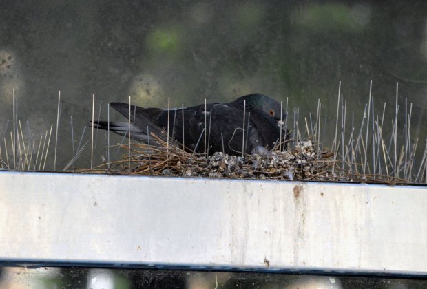 Fig 1. Nido de paloma parapetado detrás de una línea de púas./ C. Pradera 01-2017