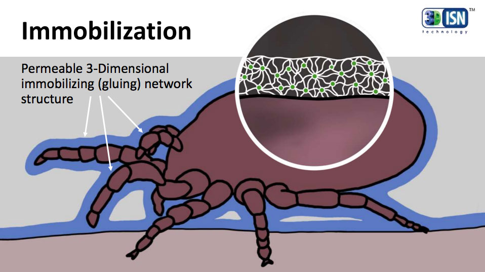 Se trata de un producto desarrollado por el laboratorio polaco ICB Pharma [2]. Consiste en la combinación de dos polímeros [3] que, una vez aplicados, forman una estructura de rejilla que impide el movimiento de los insectos y dificulta su respiración a través de los espiráculos. A este descubrimiento le han dado el nombre de tecnología 3D-ISN (Three-dimensional Immobilizing Silicone Net). Rimbombante denominación, por supuesto. Creo que en el origen de esta tecnología estaría el hecho de que hace unos años apareció el primer pediculicida que no llevaba materia activa insecticida, sino una silicona llamada dimeticona. Aplicada sobre el cabello, se deja actuar unas horas para que los piojos se impregnen y así queden tapados sus espiráculos. De hecho, una de las dos siliconas de la tecnología 3D-ISN es dimeticona.