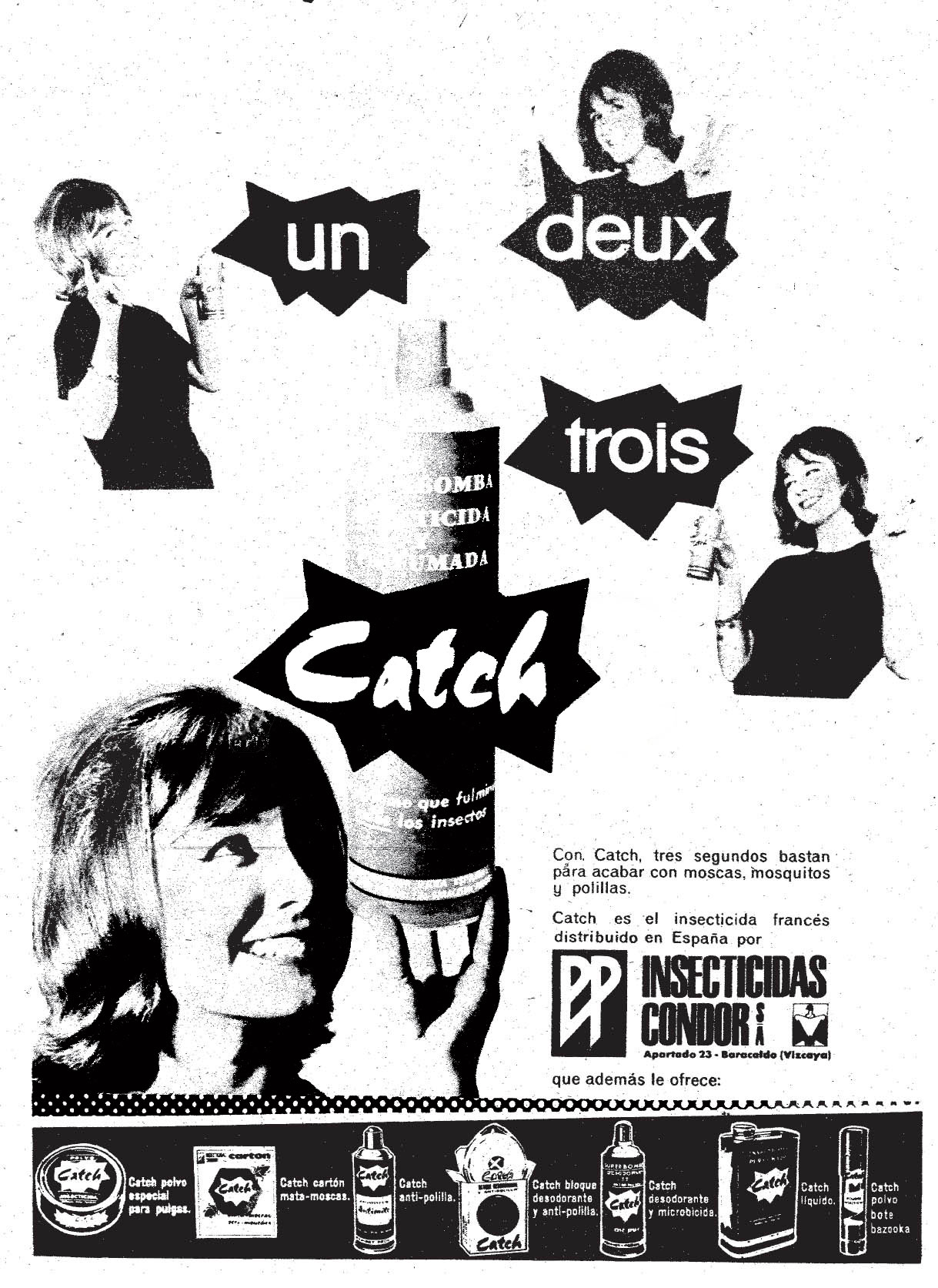 No sé con qué materia activa debía de estar formulado Catch en España. Teniendo en cuenta que era fabricado por una empresa que sintetizaba lindano, es bastante probable que esta fuera la materia activa. Hay que tener en cuenta que en España costó un poco más la introducción del bote de espray. En un artículo anterior comenté que Cruz Verde fue la primera que comercializó a principios de la década de 1950 un producto en espray que parece que no tuvo éxito [6]. Pero no fue hasta mediados de la década de 1960 que se popularizó y desbancó al popular pulverizador de émbolo o flit. La publicidad de la época hacía mención de lo fácil que era utilizar el producto y que bastaba con una pulsación de tres segundos para eliminar los insectos voladores (figura 8). En un anuncio de 1963 se pueden ver los números escritos en francés: un, deux, trois (figura 9). Un detalle interesante de este anuncio es que en la parte inferior aparecen otros formulados con la marca Catch que seguramente se vieron obligados a comercializar para adaptarse a las necesidades del público español. Hubo también Catch polvo especial para pulgas, Catch cartón mata-moscas, Catch anti-polilla, Catch bloque desodorante y anti-polilla, Catch desodorante microbicida, Catch líquido y Catch polvo bote bazooka.