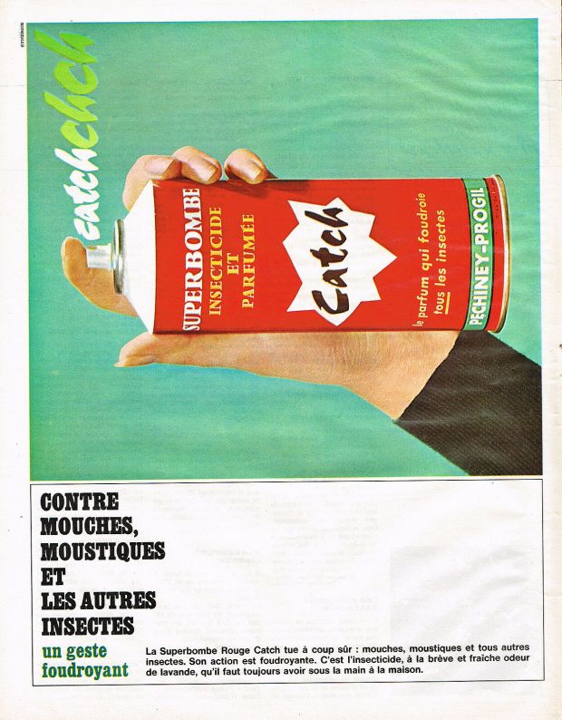 En esta entrada voy a dar cuenta de algunos datos sobre esta marca francesa de la que he encontrado poca información, pero que se puede establecer un poco sus orígenes gracias a anuncios publicitarios que he encontrado como el de la imagen número 3. Fue publicado en Francia en 1958 y es el anuncio más antiguos que he encontrado. Estéticamente la imagen está muy bien compuesta. Una niña le entrega a su abuela un bote de espray para que trate el armario contra las polillas. Y la abuela le responde que en nuestra casa no hay ninguna polilla gracias a Catch. Claramente muestra la inocuidad (la niña) y la eficacia (la abuela). Fue publicado cuando se empezó en Europa a generalizar el uso de los botes de espray. En la parte inferior del anuncio se puede leer: «Fabriqué et garanti par Péchiney-Progil.» Este es pues el fabricante original. Se trata de un importante fabricante de productos químicos fitosanitarios de Lyon, ciudad de la región francesa del Ródano (Rhône) con una centenaria tradición de industria química.