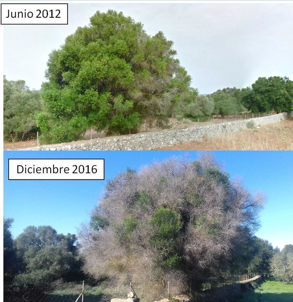 En Ibiza ya la tenemos. Muy extendida. Las autoridades no dicen ni mu. Parece que hace tiempo que lo sabian y nadie decia nada. No va a quedar un olivo vivo. Primero ataca a los acebuches o ullastres, luego a los olivos injertados milenarios. Algarrobos y sabinas parece que tambien se ven afectados. Almendros por supuesto. En 4 meses se carga un acebuche de 40 años. Las sabinas empiezan a secarse por arriba y las va matando. Triste porvenir nos espera.