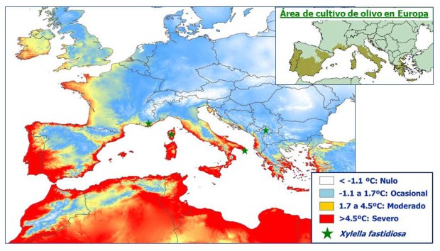 Fig 10. Potencial para el establecimiento de Xylella fastidiosa en función de las temperaturas mínimas invernales según criterio Fail & Purcell, 2001, Plant Disease 85: 1230-1234.