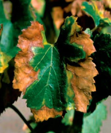 Fig 5. Hoja de vid afectada por Xylella fastidiosa./ J. D. Janse y A. Obradovic