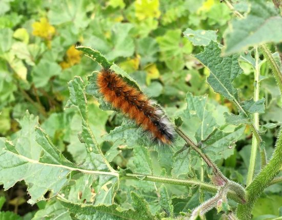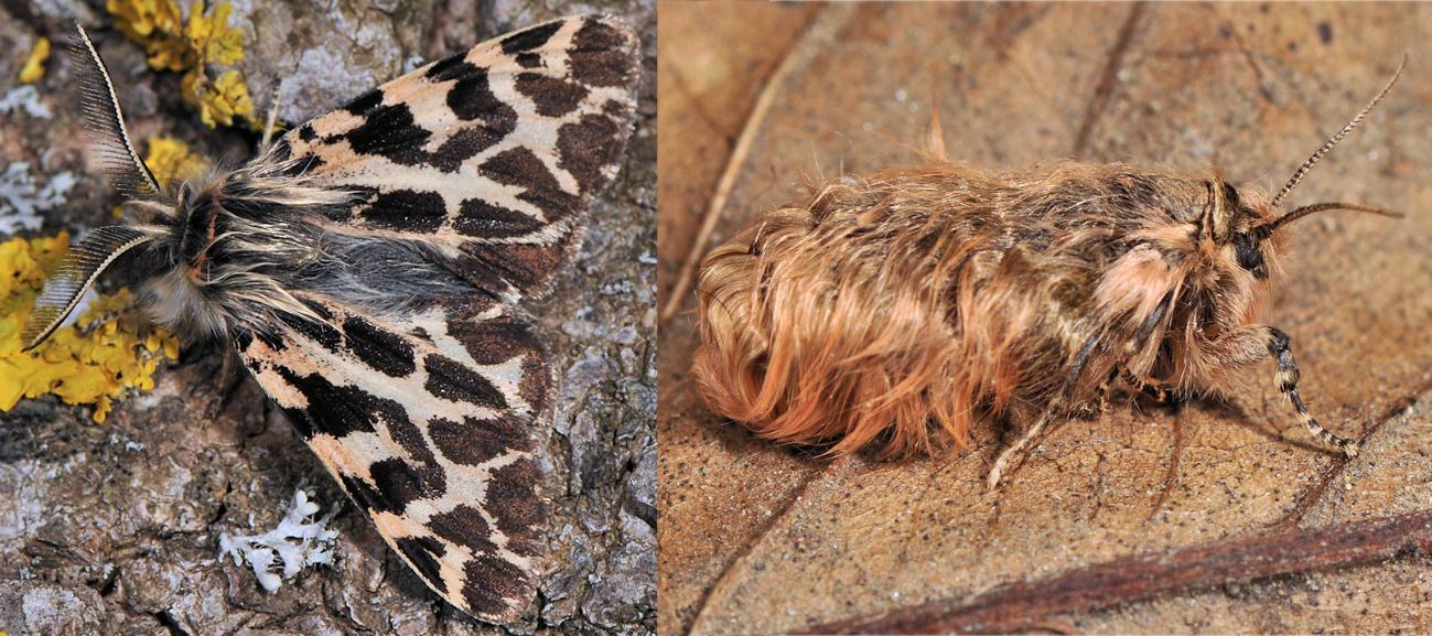 Esta especie es conocida popularmente como oruga peluda y, por su afectación en los campos de habas, también se la llama con el simpático nombre de lagarta de las habas. Es considerada una plaga en variados cultivos y se las combate por ello. Hay que destacar que suelen aparecer en las mismas zonas cada año. Y esto se debe a que la hembra es áptera y no tiene mucha movilidad. En la imagen número 3, se puede ver la imagen de un macho (izquierda) y de una hembra (derecha). Se trata de un bello caso de dimorfismo sexual. El macho tiene un bonito aspecto que recuerda a otros árctidos (Arctiidae). Y la hembra, peludita toda ella, es bien hermosa. Y también es la responsable de realizar en otoño una numerosa puesta de entre 700 y 1.000 huevos en el mismo lugar donde surgió de su estado como pupa.