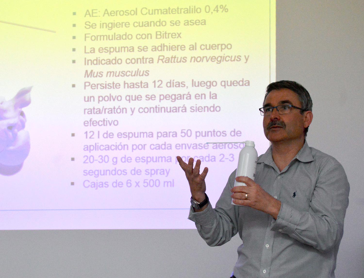 Pero en fin, vayamos a lo importante. Daniel Lucien, antes de entrar a explicar las características de Racumin Foam y cómo utilizarlo, nos ha explicado alguna novedad. Ha dicho que van a sacar una pasta para monitoreo muy palatable bajo el nombre de Harmonix Monitoring Paste. La han fabricado sin alérgenos, cumpliendo normativas como HACCP International y BRC para que pueda ser utilizada en industria alimentaria. Los roedores que ingieran la pasta dejarán rastro en sus excrementos, los cuales serán distinguibles mediante luz ultravioleta. Es posible que a medio plazo pueda aparecer algún producto rodenticida nuevo. Y a la vista está que se apruebe el uso de colecalciferol como rodenticida.