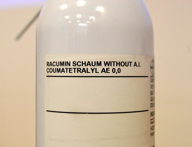 Respecto a la materia activa, hay que apuntar dos aspectos. La primera es que contiene cumatetralilo al 0’4%, cuando en un cebo suele estar del orden del 0’0375%. Esto significa 10 veces más cantidad de materia activa. La segunda es que el cumatetralilo es un anticoagulante de primera generación como la warfarina. Y, por tanto, es necesaria la ingesta múltiple. Pero no hay que confundir la ingesta múltiple de los anticoagulantes de primera generación con la ingesta múltiple de los de segunda generación. Veamos. En los de primera generación es necesario que un roedor ingiera la materia activa entre 3 y 5 días consecutivos, coma mucho o poco durante un día. Sin embargo, en los de segunda generación, con una sola ingesta en pequeña cantidad se obtiene la dosis letal. Sin embargo, por razones de autorización administrativa se limita la cantidad de materia activa en un cebo y esto lo puede convertir en cebo de ingesta múltiple. Este es el caso de la bromadiolona que años atrás se podía formular al 0’01% y ahora tan solo al 0’005% como máximo. Sin embargo, este hecho es una ventaja en el caso de Racumin Foam, ya que evita que se produzca un envenenamiento no objetivo (animal doméstico que ingiere el cebo), o un envenenamiento secundario (animal que ingiere la rata muerta por el cebo).