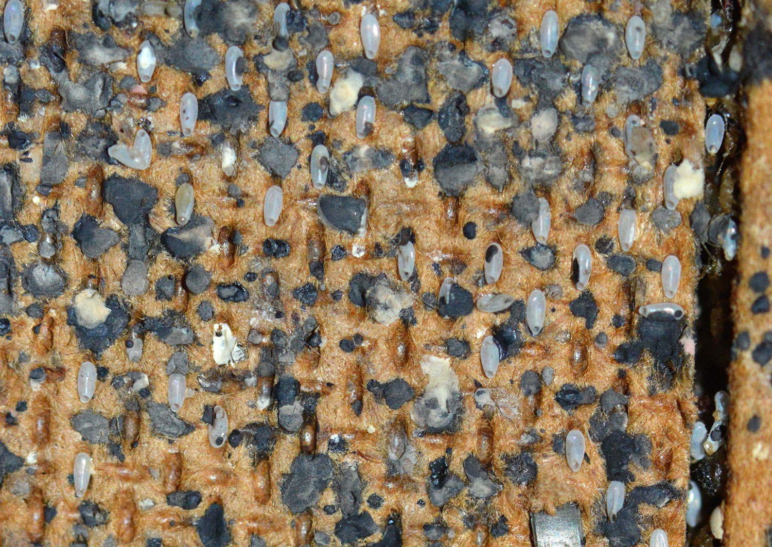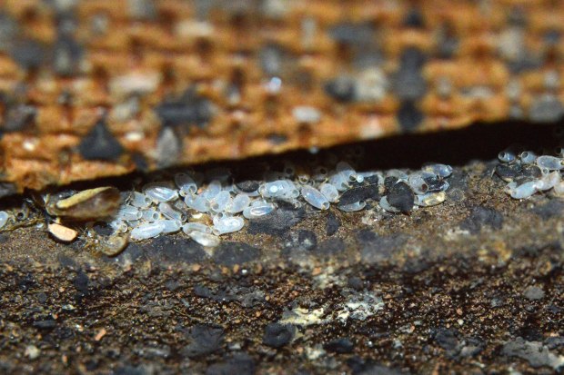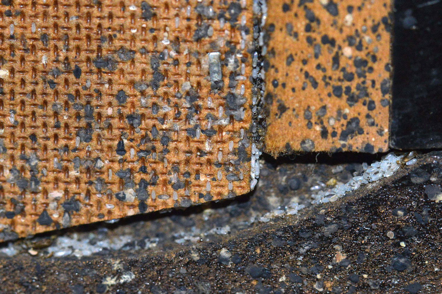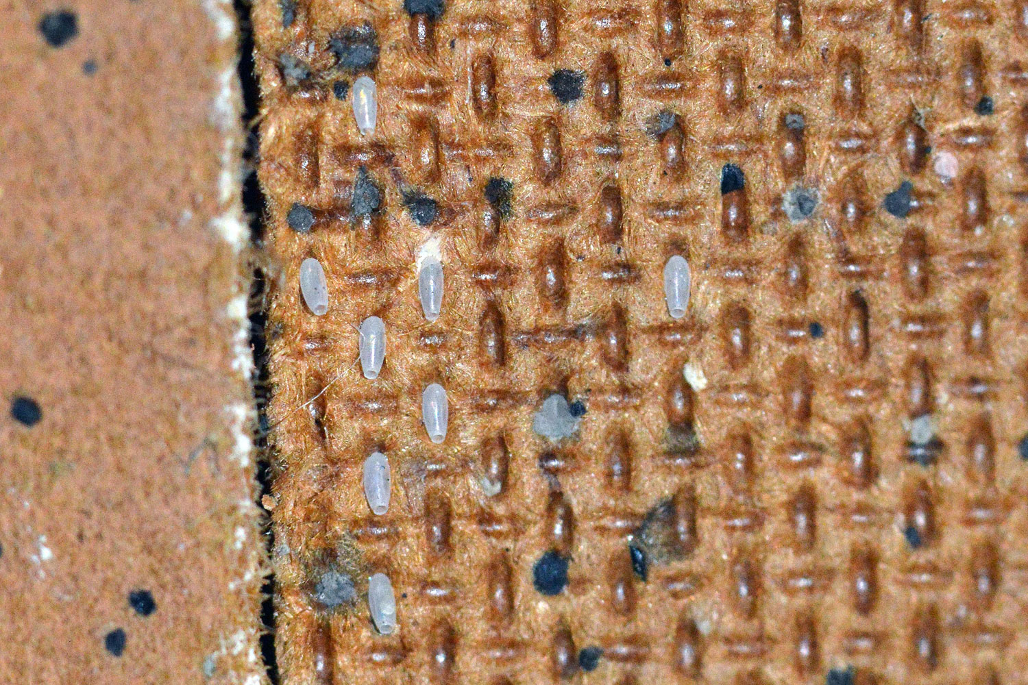 Las imágenes muestran detalles de la habitación. Se constata que está muy infestada de chinches de cama. Destacan por su magnitud las imágenes que muestran la parte posterior del zócalo de obra. Al retirar la pieza, pude ver gran cantidad de mudas y huevos, signo de que la infestación llevaba mucho tiempo. También destacan las imágenes de la gran cantidad de puestas que había detrás de la mesita de noche. Es curioso la manera en que fueron colocados los huevos aprovechando los huecos del tablero de tablex. De hecho, me recordó a las puestas de mosquito tigre (Aedes albopictus) sobre este mismo material, ya que se usan tablillas de tablex en los vasos oviposición [1].