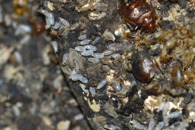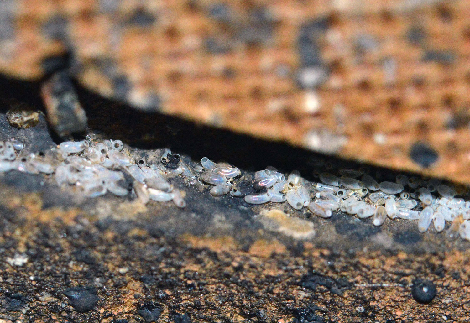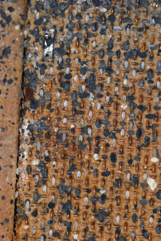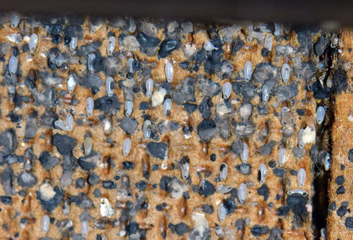 Las imágenes muestran detalles de la habitación. Se constata que está muy infestada de chinches de cama. Destacan por su magnitud las imágenes que muestran la parte posterior del zócalo de obra. Al retirar la pieza, pude ver gran cantidad de mudas y huevos, signo de que la infestación llevaba mucho tiempo. También destacan las imágenes de la gran cantidad de puestas que había detrás de la mesita de noche. Es curioso la manera en que fueron colocados los huevos aprovechando los huecos del tablero de tablex. De hecho, me recordó a las puestas de mosquito tigre (Aedes albopictus) sobre este mismo material, ya que se usan tablillas de tablex en los vasos oviposición [1].