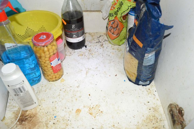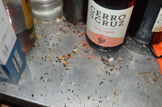 Fig 22. Marcas de grasa de ratón doméstico debajo de un mueble de cafetera./ C. Pradera 03-2017