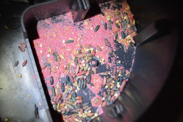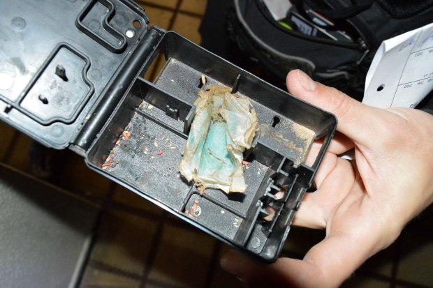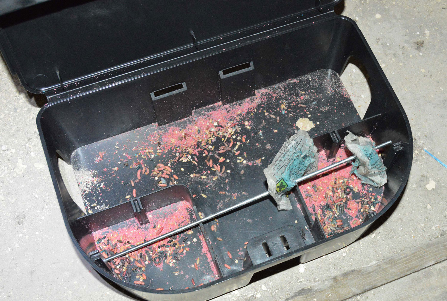 Fig 28. Portacebos Safeston con restos de rodenticida consumido./ C. Pradera 03-2017