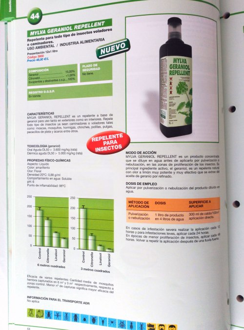 Estamos en el mes de marzo. Y quienes nos dedicamos al control de plagas tenemos, en estos momentos, sobre la mesa los catálogos de fabricantes y distribuidores para el presente año 2017. Han aparecido interesantes novedades. Una de ellas es el repelente que Mylva SA ha colocado en su catálogo y que está pendiente de registro [1]. Se llama Mylva Geraniol Repellent.