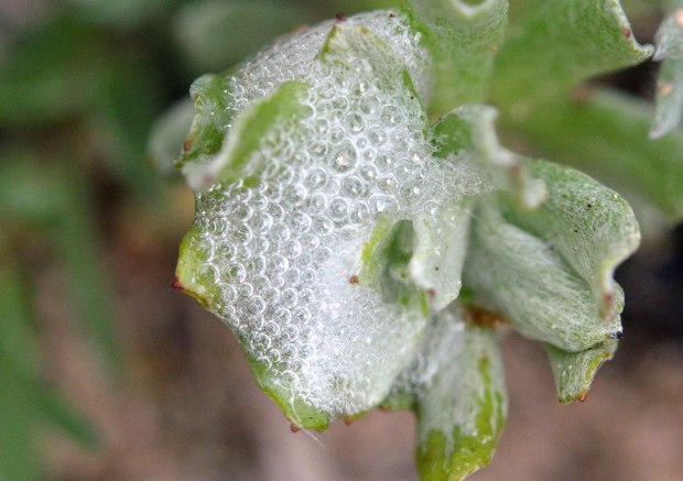La cigarra espumadora (Philaenus spumarius) se ha hecho tristemente famosa por ser el vector a través del cual la bacteria Xylella fastidiosa pasa de planta en planta [1]. En la zona donde vivo es abundante. Se la puede detectar fácilmente por la espuma que genera la ninfa para protegerse y mantener la temperatura y humedad adecuadas para su desarrollo. En las imágenes se puede ver el espumajo adherido sobre plantas. Dependiendo del tamaño de la ninfa, el espumajo varía. Al retirar la espuma, aparece una ninfa de aspecto tierno y delicado.