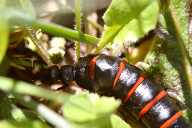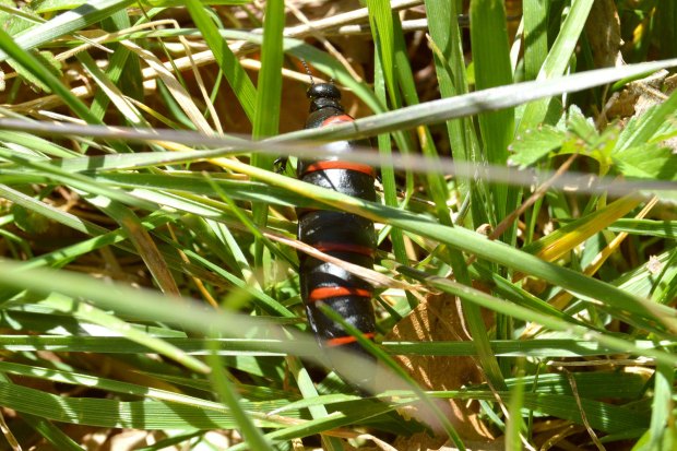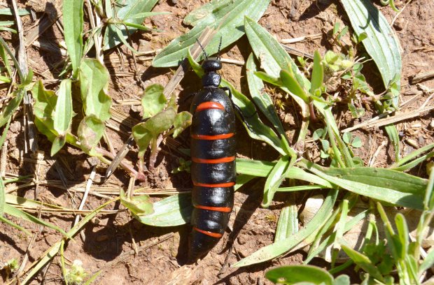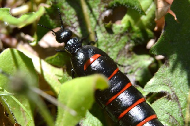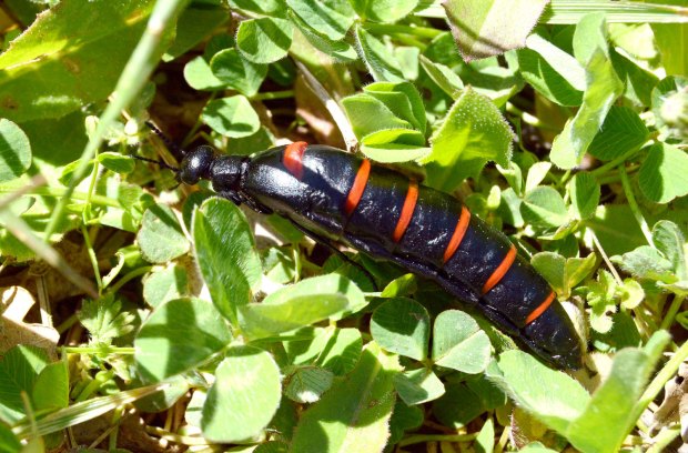 Caminábamos por un prado cercano a Estany, Barcelona. Mi mujer me frenó y me dijo: «¡Espera que he visto algo!» Miré hacia donde me señalaba y vi lo que parecía una gran larva negra con bandas rojas. Entonces saqué la cámara fotográfica y me agaché rápido para ver exactamente qué era. Vi que se trataba de un coleóptero de la familia Meloidae. Y esto significa: ¡atención, cuidado, no tocar! Al vernos, el insecto corrió a esconderse debajo de las hierbas. Cogí un palito y lo empujé por el culo para que saliera. Quería tomar una buena foto de este peculiar insecto. Empezó a correr y fui detrás tomando fotos hasta que se metió entre unas matas. Para lo gordote y grande que era, de unos 5 centímetros de largo, se movía deprisa.