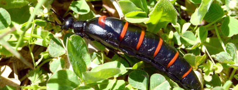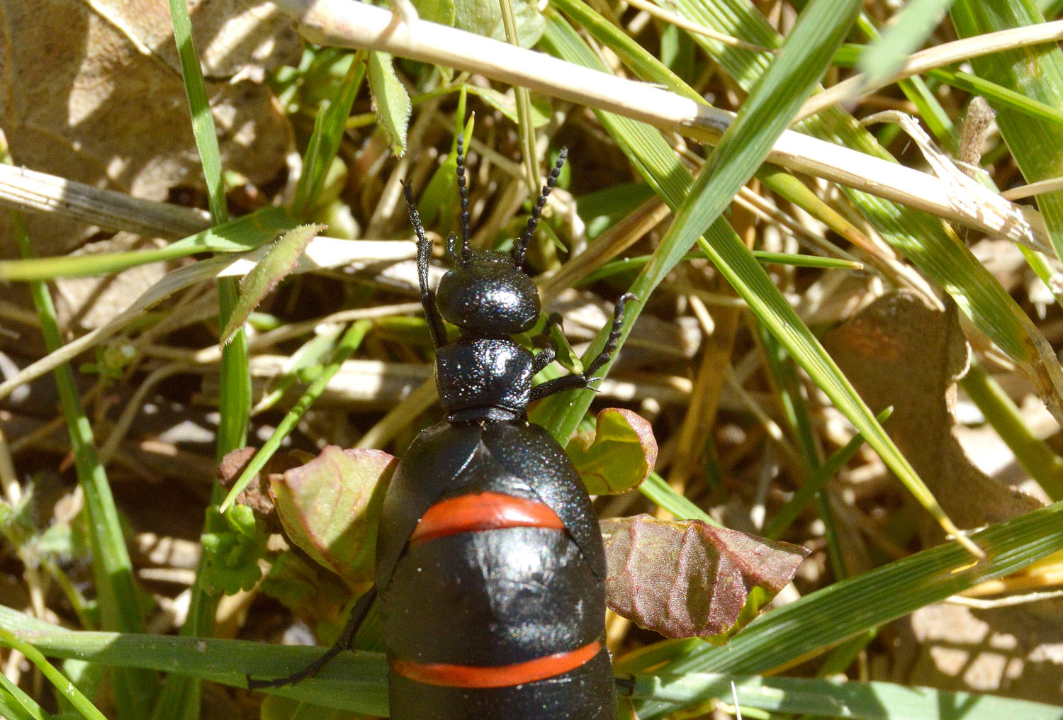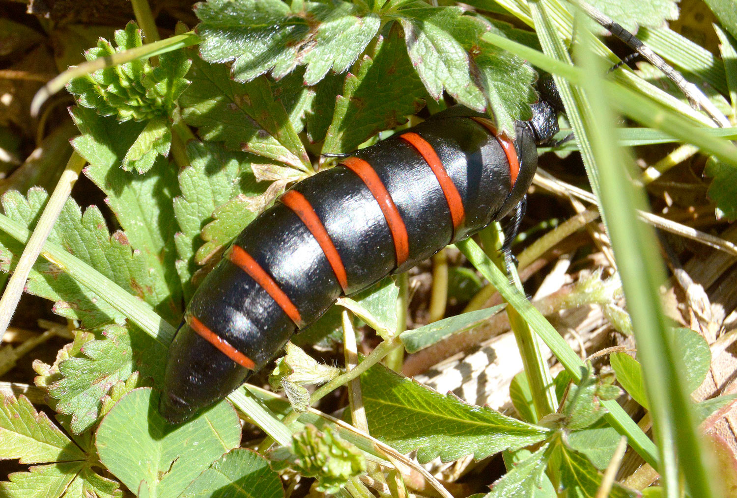 Caminábamos por un prado cercano a Estany, Barcelona. Mi mujer me frenó y me dijo: «¡Espera que he visto algo!» Miré hacia donde me señalaba y vi lo que parecía una gran larva negra con bandas rojas. Entonces saqué la cámara fotográfica y me agaché rápido para ver exactamente qué era. Vi que se trataba de un coleóptero de la familia Meloidae. Y esto significa: ¡atención, cuidado, no tocar! Al vernos, el insecto corrió a esconderse debajo de las hierbas. Cogí un palito y lo empujé por el culo para que saliera. Quería tomar una buena foto de este peculiar insecto. Empezó a correr y fui detrás tomando fotos hasta que se metió entre unas matas. Para lo gordote y grande que era, de unos 5 centímetros de largo, se movía deprisa.