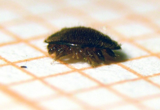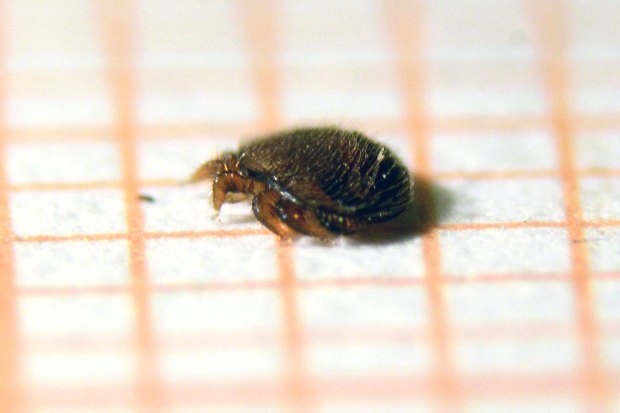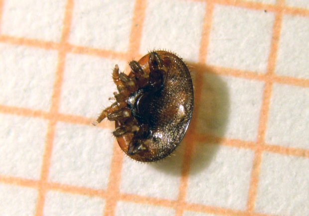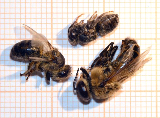 La semana pasada Jordi Ruiz de Biotrack [1] me pasó los tres ejemplares de abeja de la miel (Apis mellifera) que se pueden ver en la imagen número 1. Fueron recogidos en un edificio de la Sagrera de Barcelona en cuya cámara de aire se habían establecido. El color y forma de estas abejas sorprendió a Jordi Ruiz, lo que le hizo dudar de si estaba ante Apis mellifera, pero la venación de sus dos alas disipó sus dudas (figura 2). Consultando con un apicultor llegó a la conclusión de que se trataba de una hibridación con abeja negra canaria. Esto explicaría su particular color, ya que es una abeja de linaje africano. Respecto a la forma, muchos ejemplares de la colonia eran de menor tamaño. Y esto es debido a que la colonia estaba afectada por el ataque del ácaro Varroa. De hecho, junto con los tres ejemplares, me llegó una hembra de Varroa que he intentado fotografiar lo mejor posible a pesar de su pequeño tamaño de entre 1 y 2 mm (figuras 3 a 8).