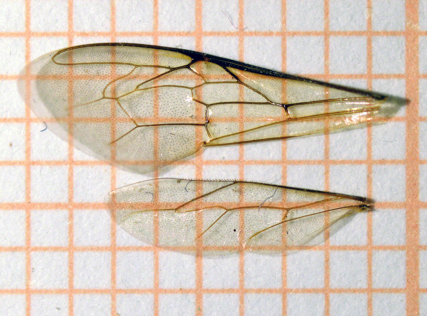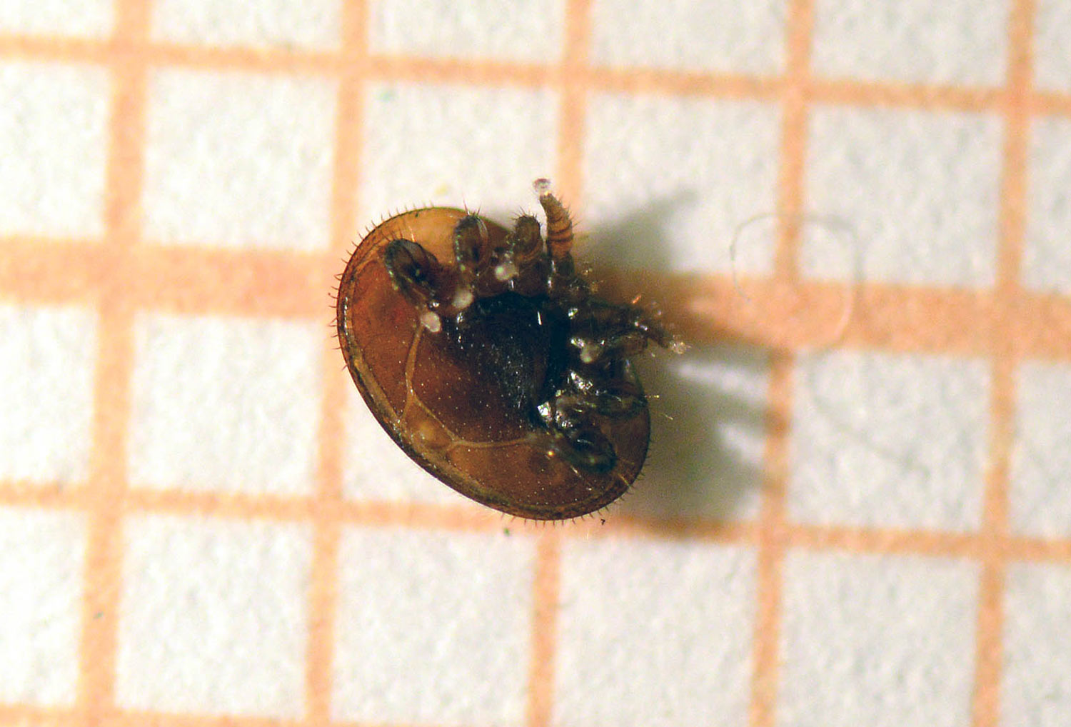 La semana pasada Jordi Ruiz de Biotrack [1] me pasó los tres ejemplares de abeja de la miel (Apis mellifera) que se pueden ver en la imagen número 1. Fueron recogidos en un edificio de la Sagrera de Barcelona en cuya cámara de aire se habían establecido. El color y forma de estas abejas sorprendió a Jordi Ruiz, lo que le hizo dudar de si estaba ante Apis mellifera, pero la venación de sus dos alas disipó sus dudas (figura 2). Consultando con un apicultor llegó a la conclusión de que se trataba de una hibridación con abeja negra canaria. Esto explicaría su particular color, ya que es una abeja de linaje africano. Respecto a la forma, muchos ejemplares de la colonia eran de menor tamaño. Y esto es debido a que la colonia estaba afectada por el ataque del ácaro Varroa. De hecho, junto con los tres ejemplares, me llegó una hembra de Varroa que he intentado fotografiar lo mejor posible a pesar de su pequeño tamaño de entre 1 y 2 mm (figuras 3 a 8).