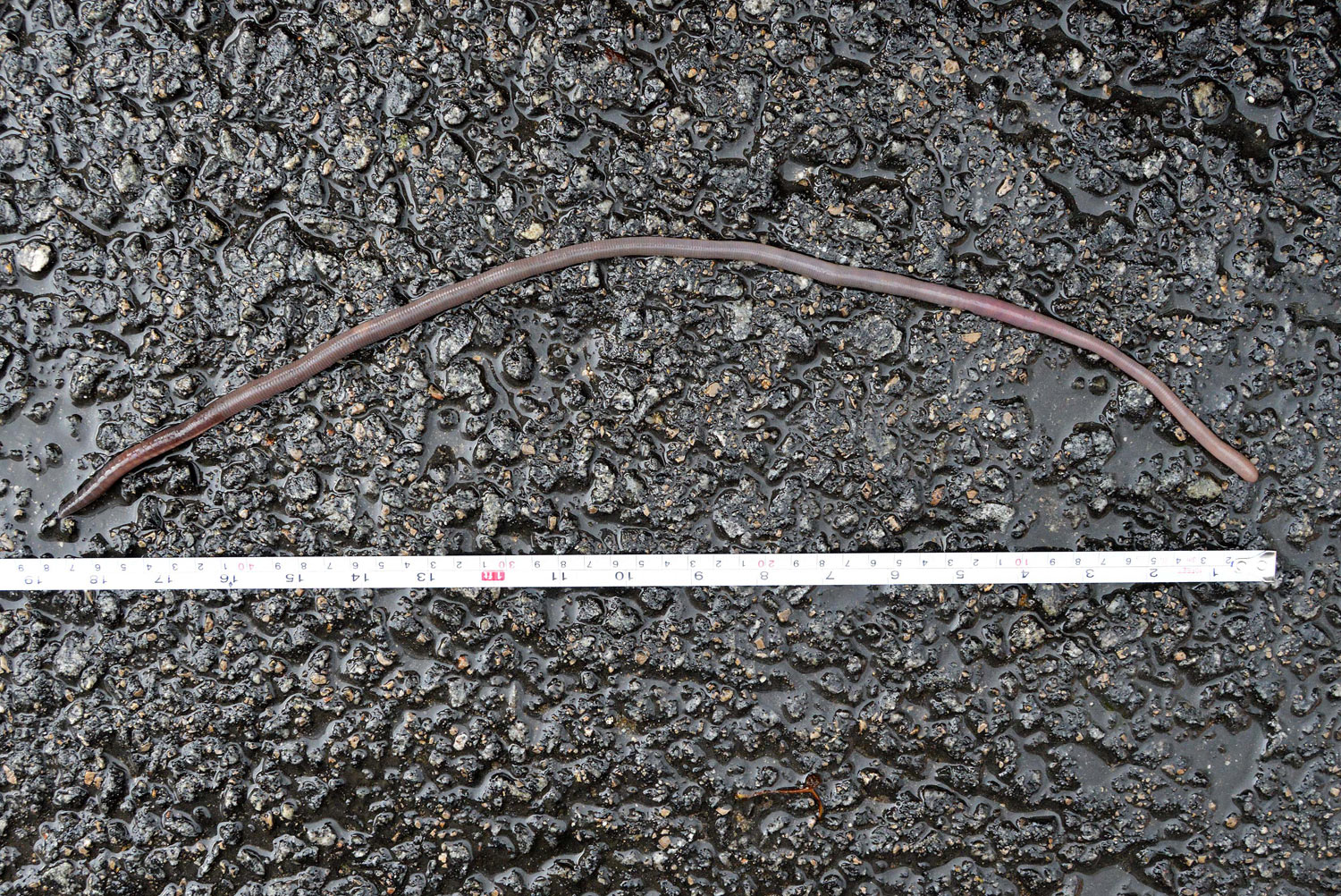 [1] Es probable que sea un ejemplar de Lumbricus spp que puede tener una longitud de hasta 25 cm por 1 cm de ancho. En el interior peninsular abunda Lumbricus terrestris, mientras que en la zona mediterránea abunda Lumbricus friendi.