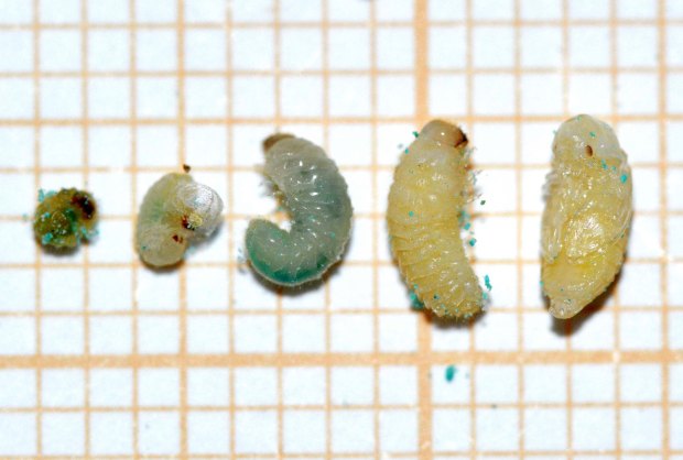 Fig 14. Larvas de carcoma del pan (Stegobium paniceum)./ C. Pradera 03-2017