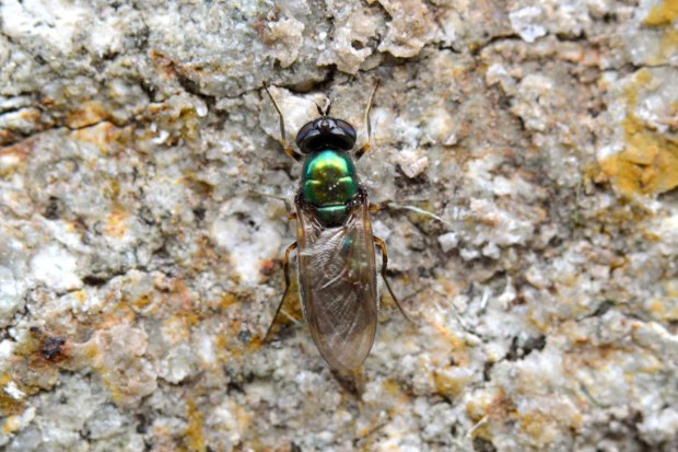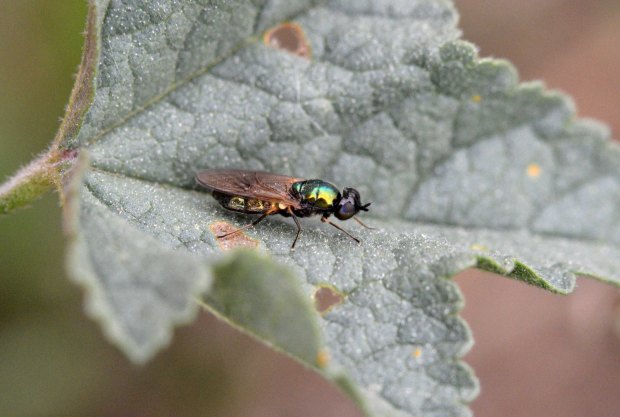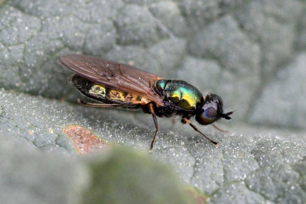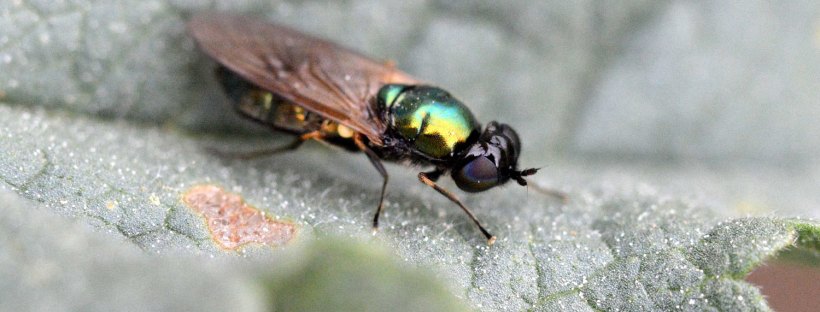 Durante la primavera y principios de verano es relativamente fácil observar moscas del género Chloromyia en prados y zonas abiertas con flores. Son moscas cuyos colores metálicos aportan gran belleza. Este género tiene en la Península Ibérica dos representantes, C. formosa y C. speciosa. Las alas marrones y los pelos de los tarsos oscuros indican que el individuo de las imágenes pertenece a la primera especie.