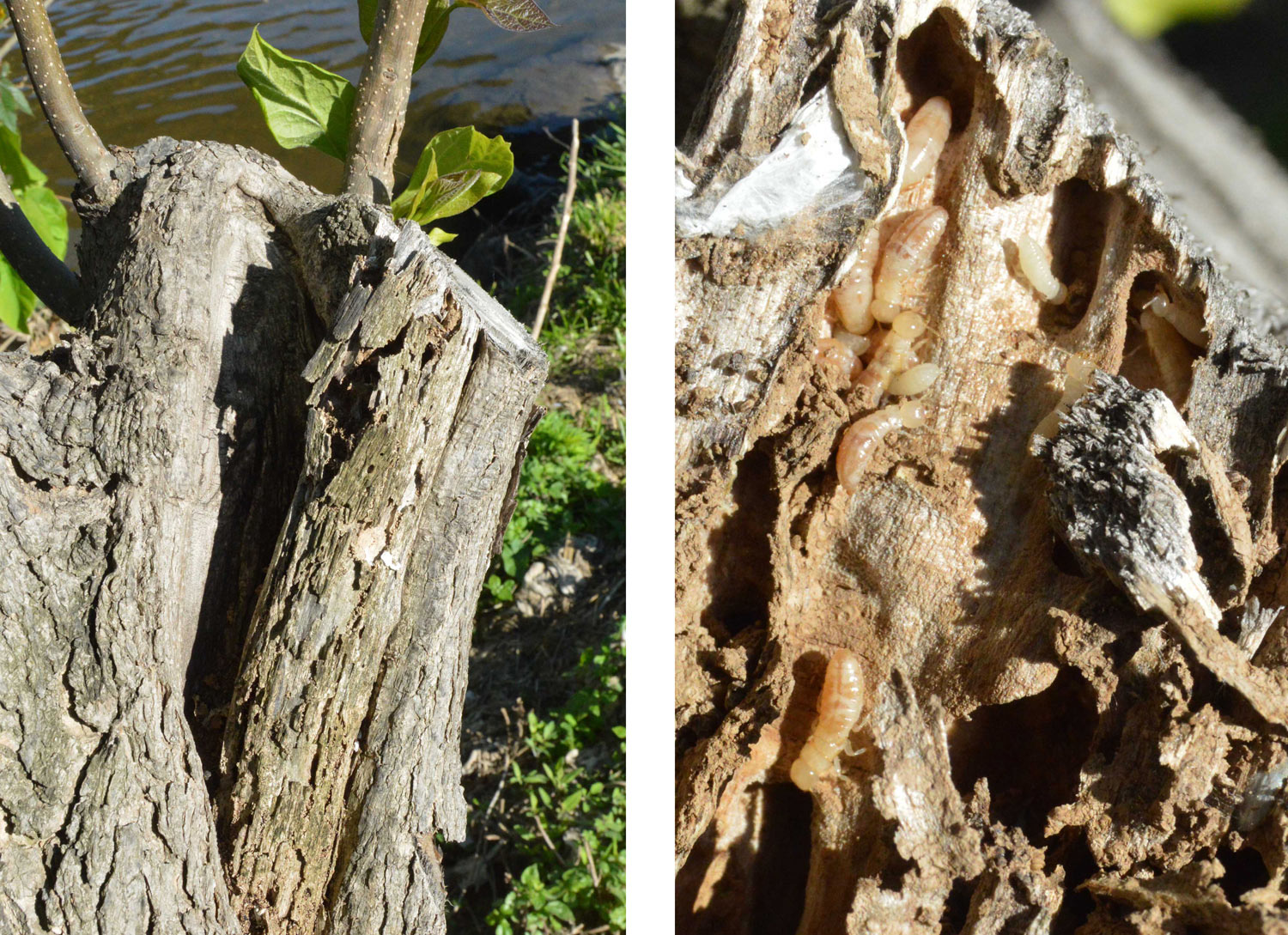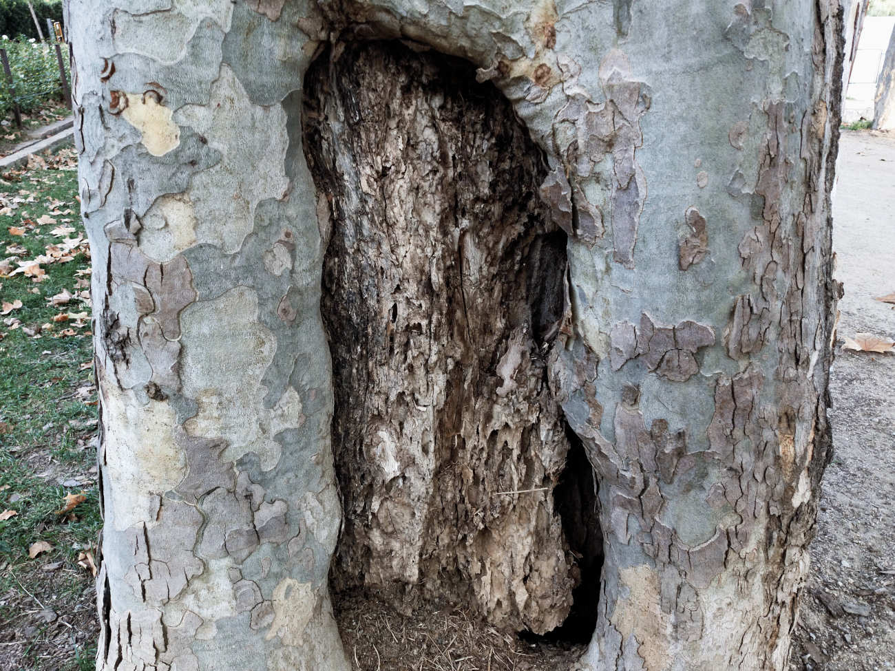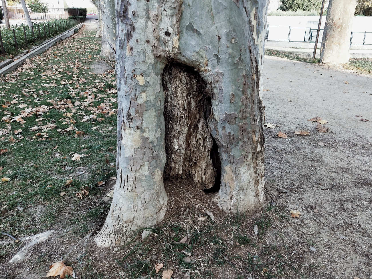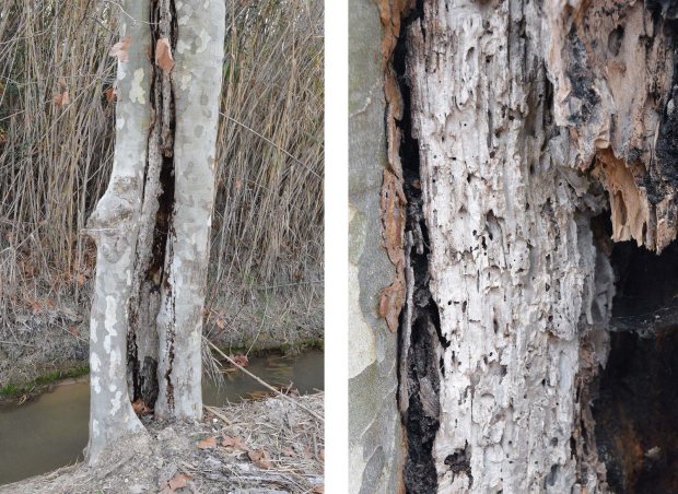 Es cierto que la principal vía de acceso de las termitas son las heridas de poda, pero también cabe mencionar los daños producidos por impacto. Una vez se instalan, las galerías practicadas facilitan la entrada de agua, hongos y bacterias. Todo ello inicia un proceso de pudrición que facilita aún más la extensión del ataque de las termitas. El tiempo juega a su favor y se van produciendo huecos en el árbol. En los casos más extremos, se observa el tronco totalmente vacío. Donde vivo no es difícil encontrar ejemplares de plátano de sombra con un fuerte ataque.