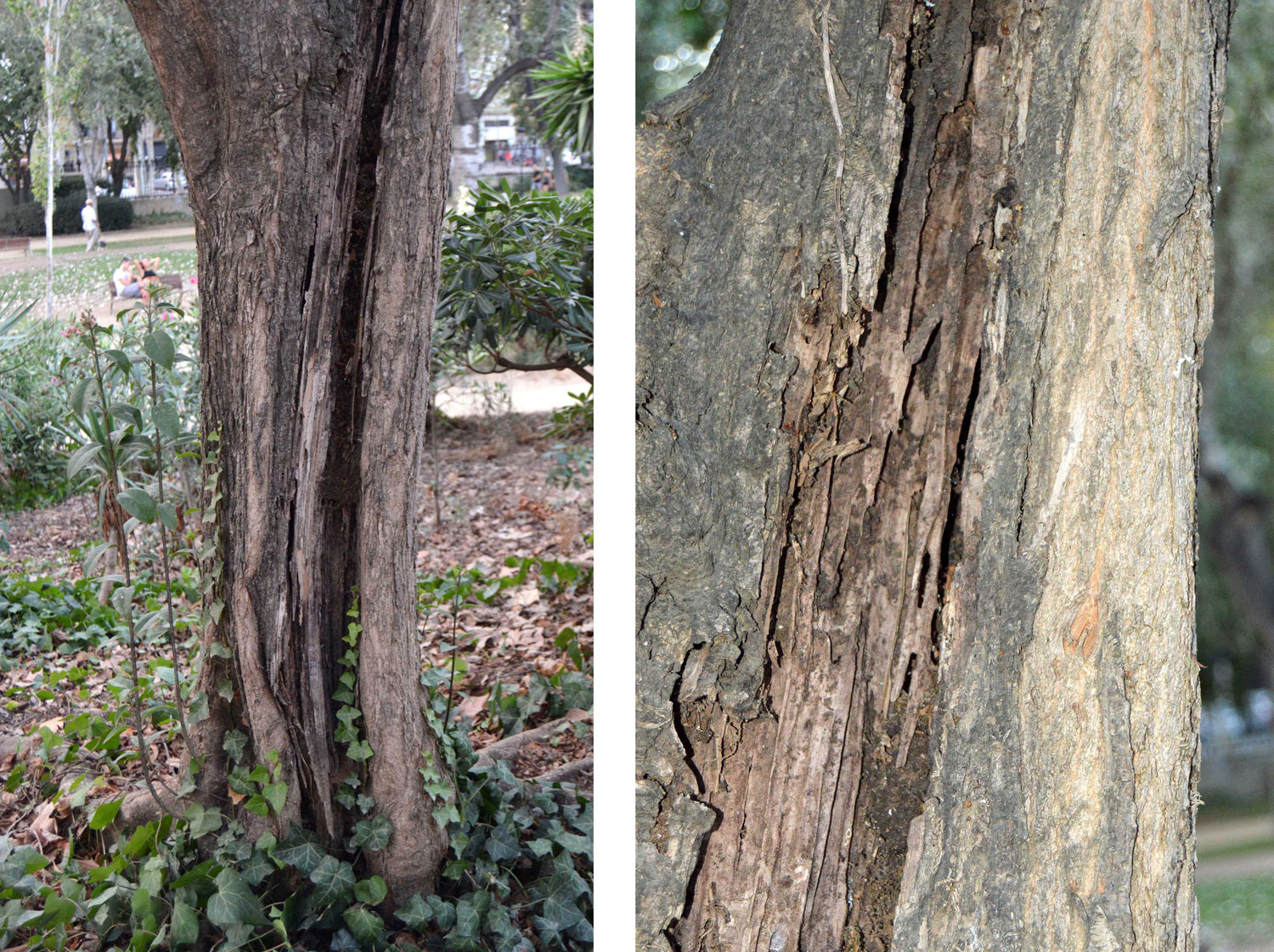 Fig 19. Afectación por termita Kalotermes flavicollis en plátanos de sombra en el Parque de Ca l’Arnús, Badalona./ C. Pradera 10-2020