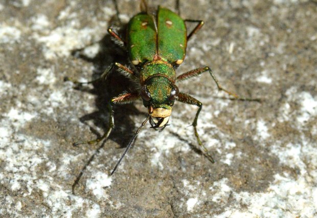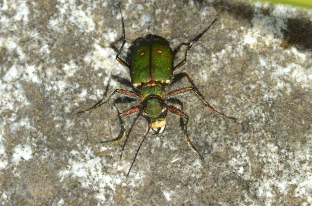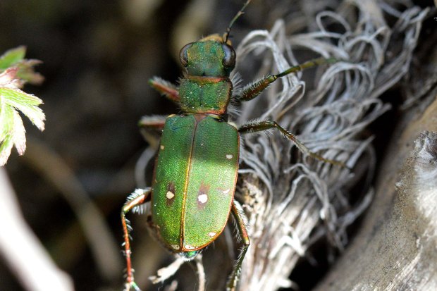 Encontré una cicindela campestre (Cicindela campestris) en un camino que discurre junto al río Ter en el pantano de El Pasteral, Girona. Como se puede ver en las imágenes es un escarabajo muy bonito. Su parte superior es verde metálico y su parte inferior y patas de un malva metálico. Es una combinación atrevida. Si a estos colores sumamos las manchas blancas sobre los élitros, su forma y el tamaño de unos 15 mm, tenemos un insecto fácil de reconocer.