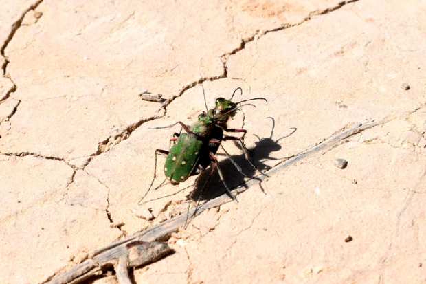 A la cicindela de las imágenes le faltaba una antena. Posiblemente la pudo perder en algún enfrentamiento con una presa. La larva también es cazadora. Construye un túnel recto y perpendicular a la superficie desde el que acecha a sus víctimas. Por la salida del túnel la larva asoma discretamente a la espera de atrapar una presa. El lugar ideal para encontrarlas es en suelos arenosos cercanos al agua.