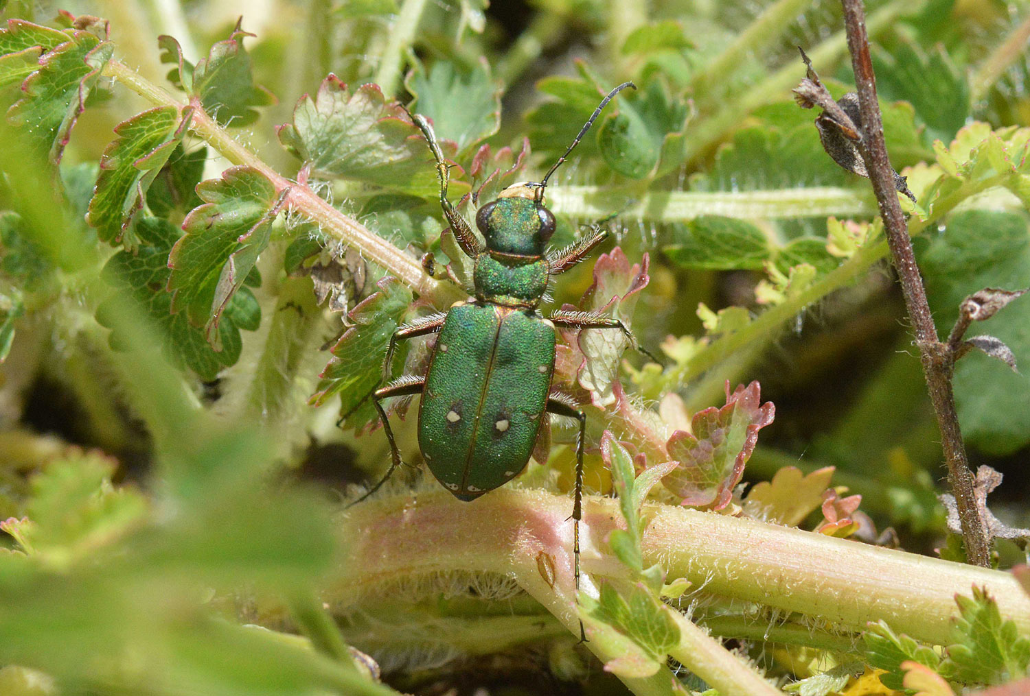 Encontré una cicindela campestre (Cicindela campestris) en un camino que discurre junto al río Ter en el pantano de El Pasteral, Girona. Como se puede ver en las imágenes es un escarabajo muy bonito. Su parte superior es verde metálico y su parte inferior y patas de un malva metálico. Es una combinación atrevida. Si a estos colores sumamos las manchas blancas sobre los élitros, su forma y el tamaño de unos 15 mm, tenemos un insecto fácil de reconocer.