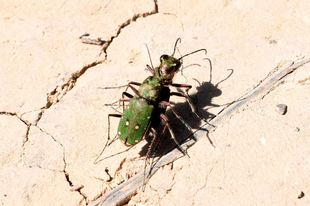 A la cicindela de las imágenes le faltaba una antena. Posiblemente la pudo perder en algún enfrentamiento con una presa. La larva también es cazadora. Construye un túnel recto y perpendicular a la superficie desde el que acecha a sus víctimas. Por la salida del túnel la larva asoma discretamente a la espera de atrapar una presa. El lugar ideal para encontrarlas es en suelos arenosos cercanos al agua.