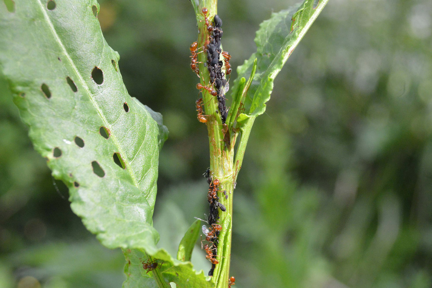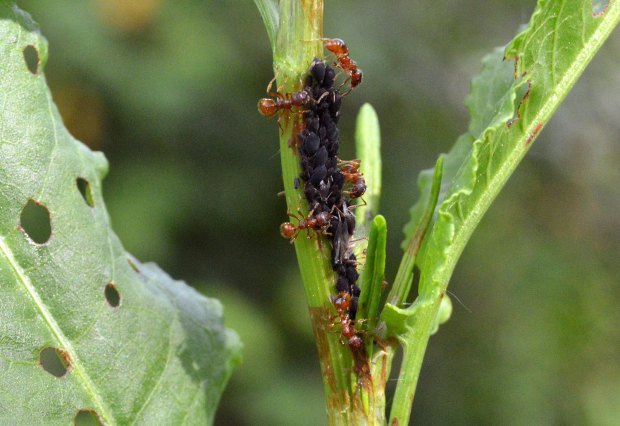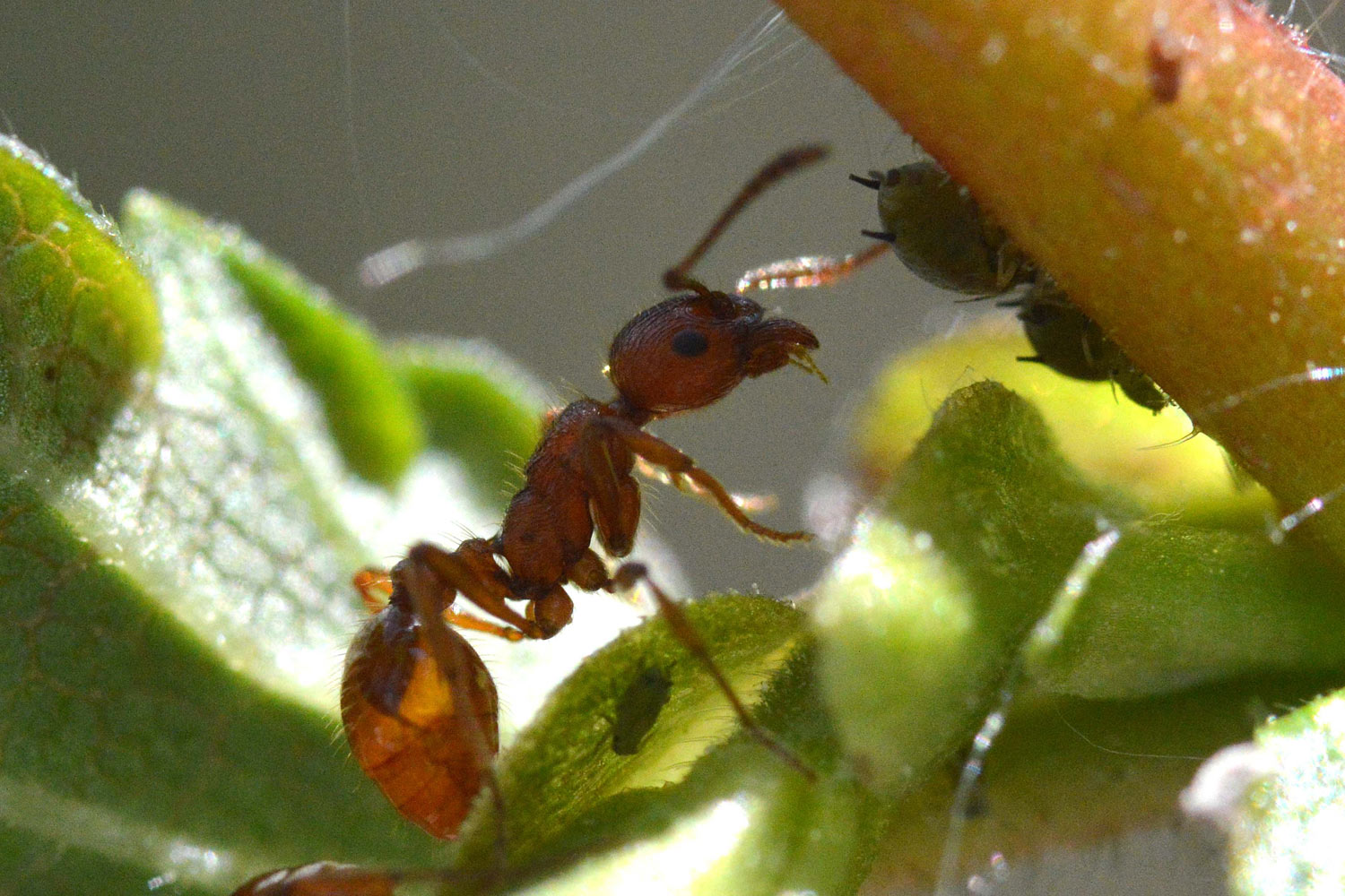 Nada más sentarnos a comer, se subieron rápidamente sobre el mantel para ver qué podían llevarse. No las vi muy emocionadas con los trocitos minúsculos de patatas fritas. A un par de palmos de distancia tenía una planta con pulgones y allí estaban las obreras recogiendo melaza. Esta especie mide entre 3’5 y 5 mm. Se encuentra distribuida por gran parte de Europa. En la Península Ibérica está ausente en el Sur, Portugal, cornisa cantábrica y franja próxima al Mediterráneo. Prefiere las zonas húmedas como es la cercanía a cursos de agua. Se puede confundir con otra especie muy parecida como es Myrmica ruginodis, especie que sí está presente en toda la Península Ibérica desde cotas bajas hasta los 2.000 m.