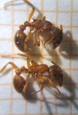 En la imagen número 2, se pueden ver dos obreras de ambas especies. En la parte superior hay una de Myrmica ruginodis y, en la parte inferior, una de M. rubra. Se diferencian por lo siguiente: M. rugicornis tiene las espinas del propodeo más largas, el espacio entre las espinas es rugoso y el peciolo también es rugoso. El ejemplar de M. rugicornis lo encontré en un prado de l’Estany, Moià (Barcelona). Tenían instalado el hormiguero bajo una piedra. Otra diferencia entre ambas es que M. rugicornis forma una colonia con una sola reina (monogínica) y con unos pocos centenares de obreras. En cambio, M. rubra forma colonias con muchas reinas (poligínica) y con muchos centenares de obreras. De esto doy fe, porque donde me senté a comer pude observar que en una amplia zona había gran cantidad de obreras por todas partes. Y no observé ninguna otra especie. Según parece son agresivas y utilizan el aguijón si es necesario.