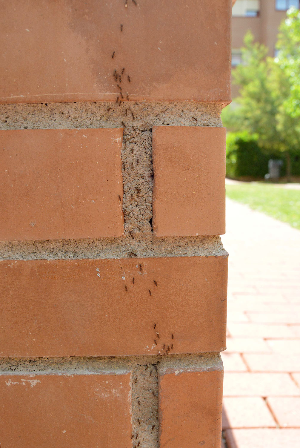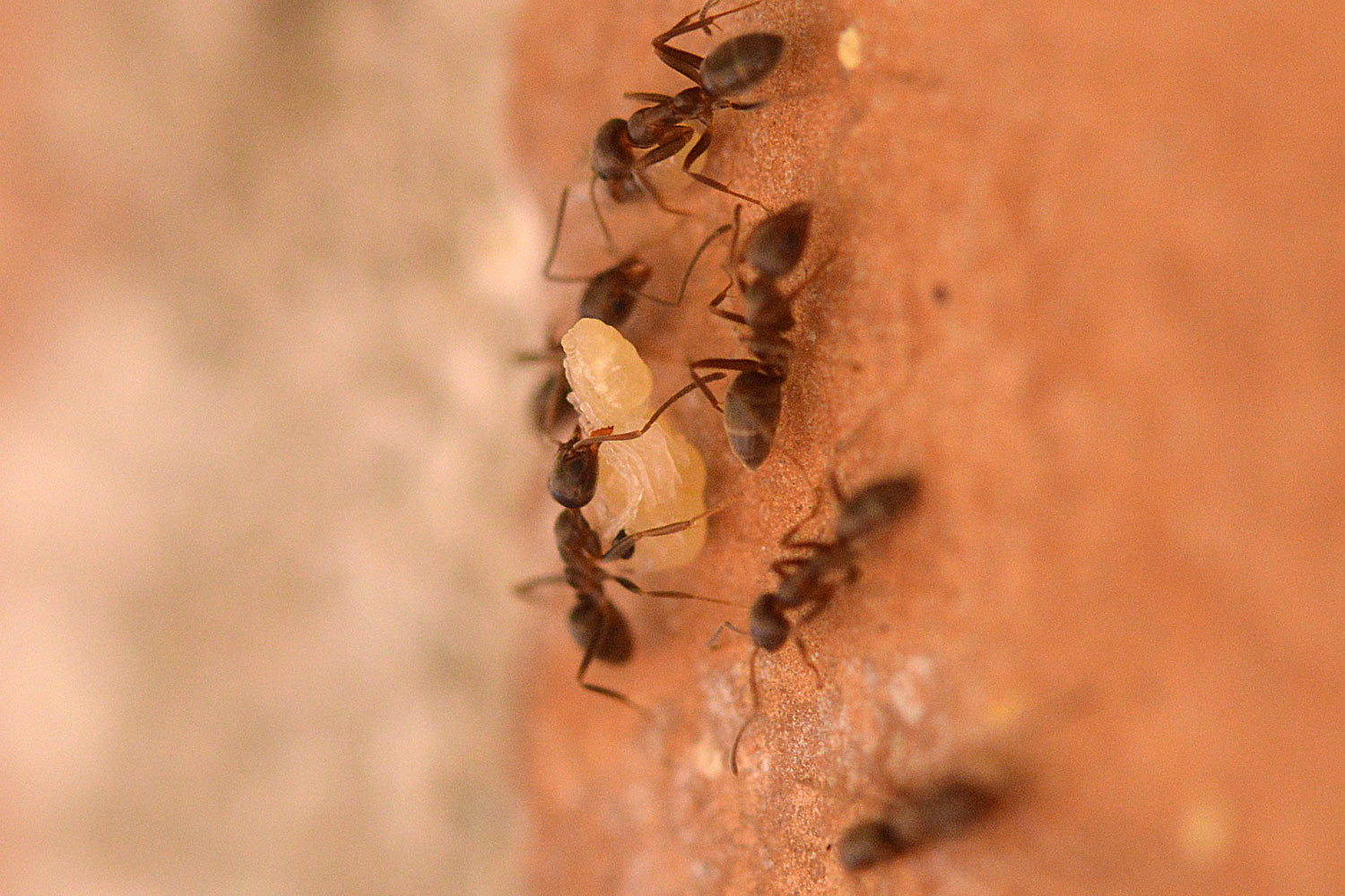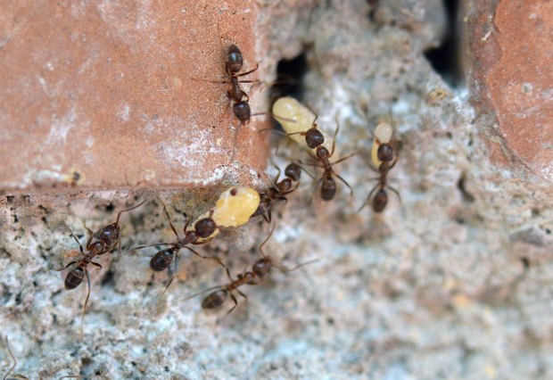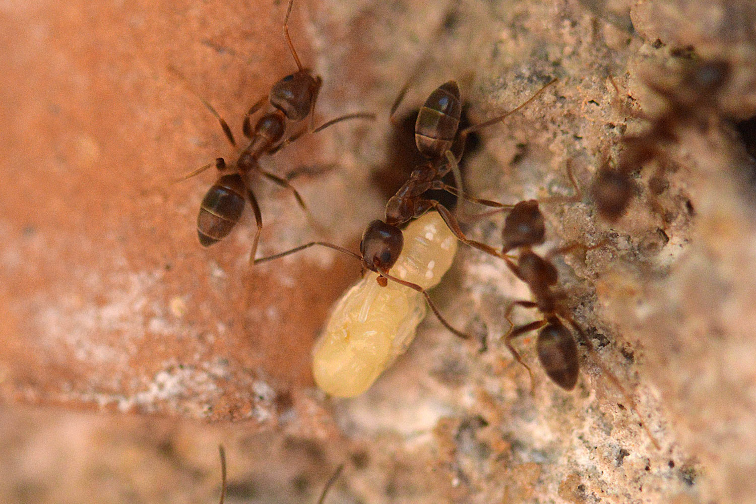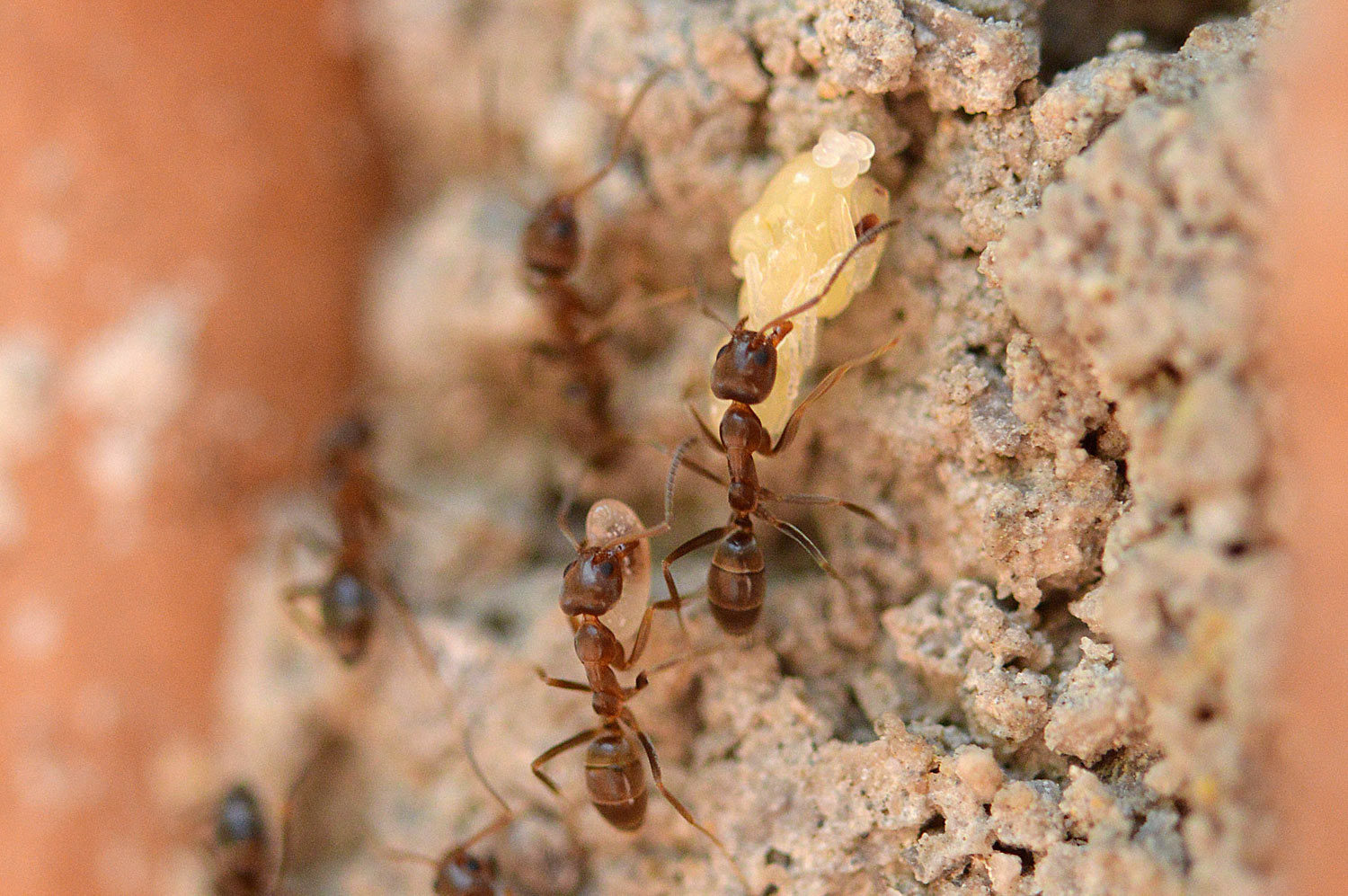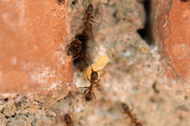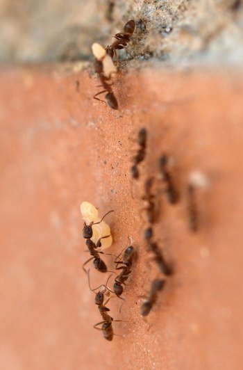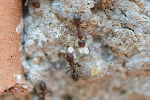 Por otra parte, en la pista se podían ver obreras que transportaban huevos, larvas y ninfas. En las imágenes que ilustran esta entrada, se pueden ver obreras realizando traslados de la progenie. Hemos de entender que las hormigas habilitan diferentes cámaras para la incubación de huevos, para el desarrollo de las larvas y para las ninfas. Y que buscan el mejor lugar para su desarrollo trasladándolos a lugares con las condiciones óptimas necesarias en cada momento. Por lo que tengo entendido, para el rápido desarrollo de las ninfas, suelen buscar lugares bien caldeados. En la imagen número 1, la pista discurre entrando y saliendo por los agujeros de un muro de una jardinera que queda al sol del mediodía. Un lugar con humedad y temperatura idóneas para criar la progenie.
