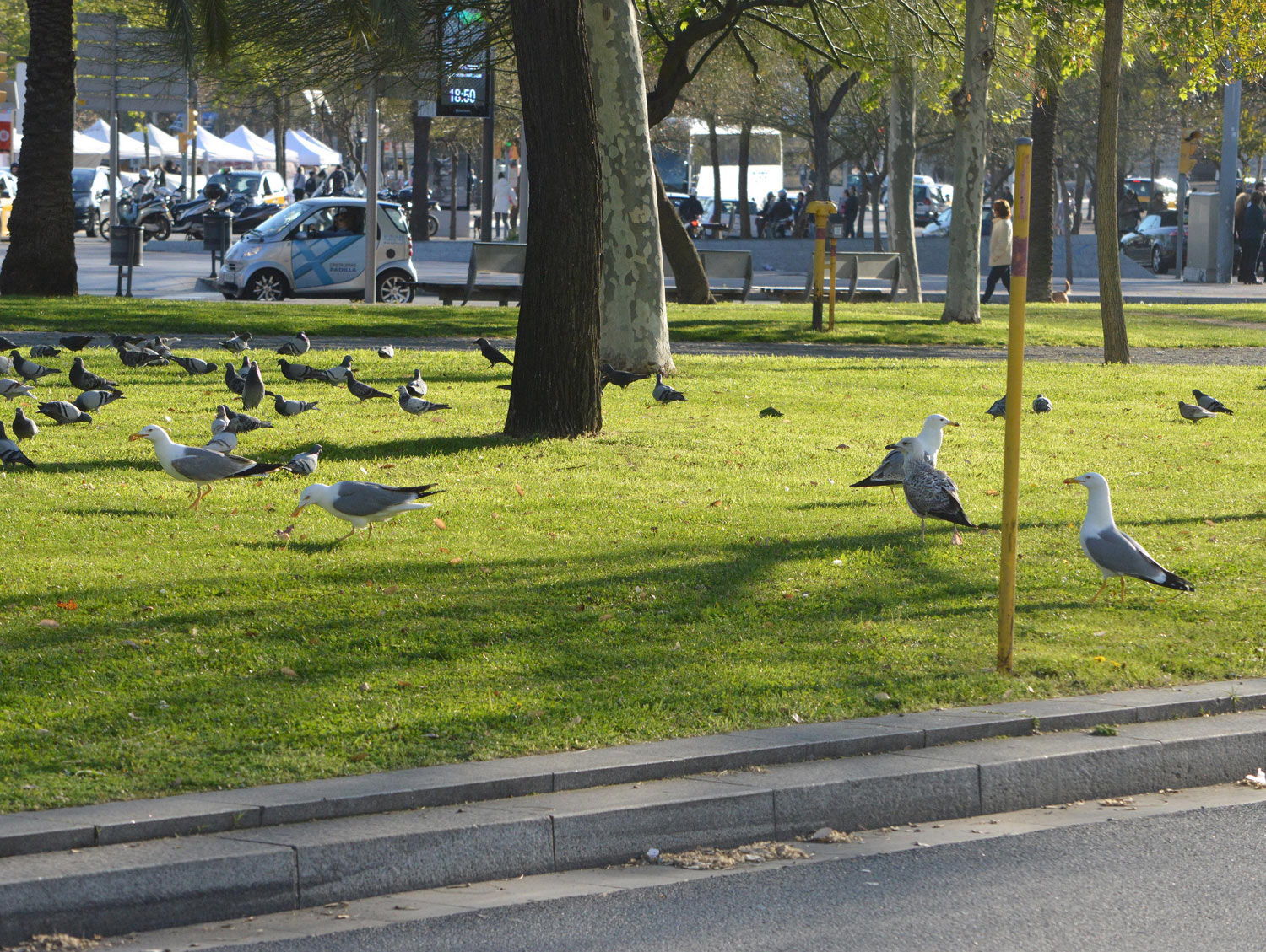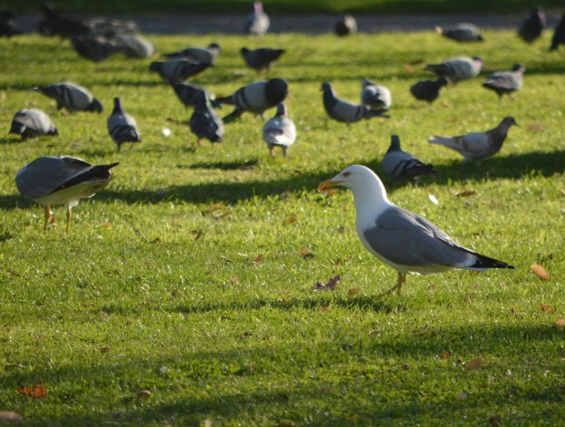 Fig 3. Gaviotas y palomas atraídas por la alimentadoras de la plaza Pau Vila de Barcelona./ C. Pradera 04-2016