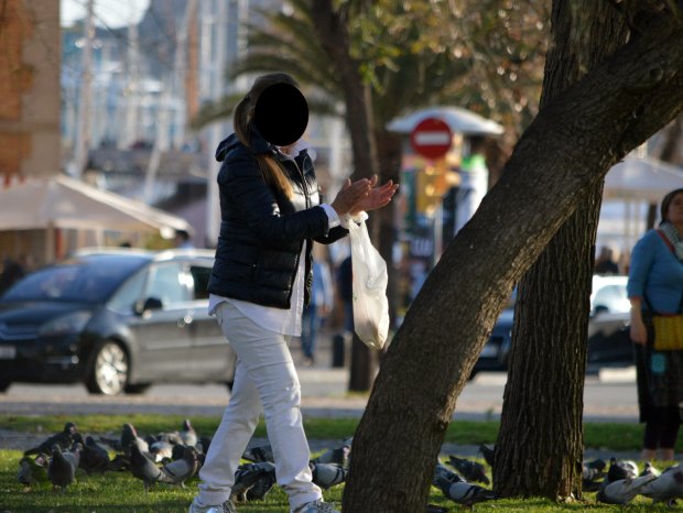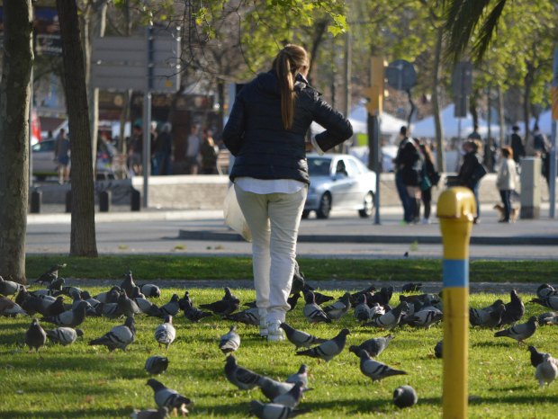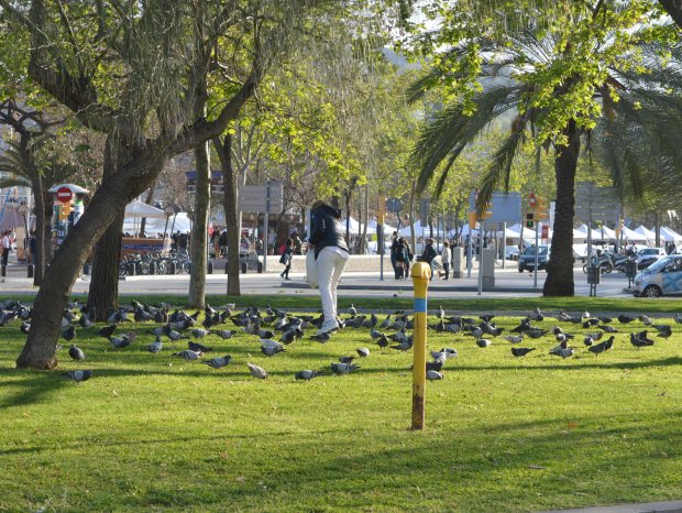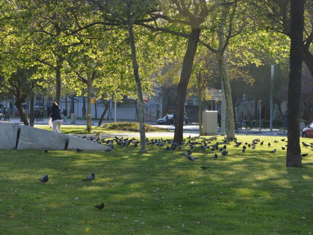 Constato que cada día hay más alimentadores de palomas. Los hay de dos tipos. Están los que lo hacen de manera velada porque saben que pueden ser denunciados. Estos suelen dejar la comida de manera rápida y junto a contenedores de la basura. Luego están quienes lo hacen a cara descubierta como esta persona que alimenta palomas en la plaza Pau Vila.