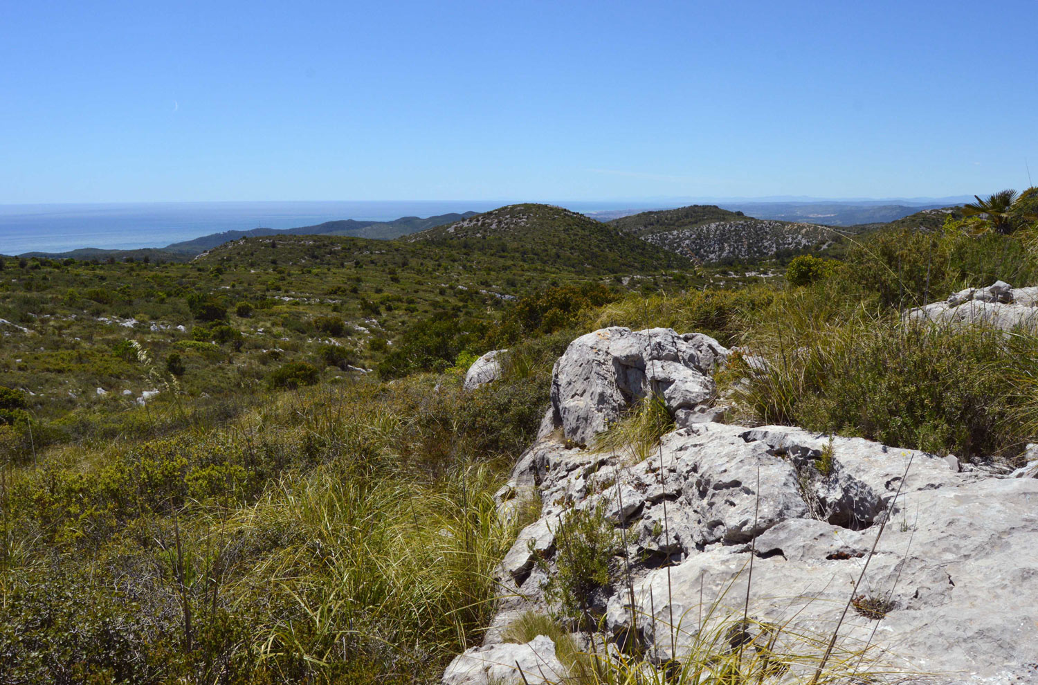 El pasado sábado pude disfrutar de una magnífica mañana en el macizo del Garraf, en Begues. El cielo estaba limpio y sin nubes. Soplaba un viento un poco fuerte, pero soportable. La temperatura máxima fue de unos 22º C. Al ser primavera, el paisaje estaba verde y florecido. El Garraf es una zona única y espectacular. Se trata de un macizo formado por roca calcárea que el agua ha ido modelando para dar lugar una superficie abrupta. La vegetación es baja y se encuentra bien adaptada. La combinación de plantas y rocas grisáceas es de gran belleza. A su propio encanto cabe sumarle el hecho de que se encuentra junto al mar.