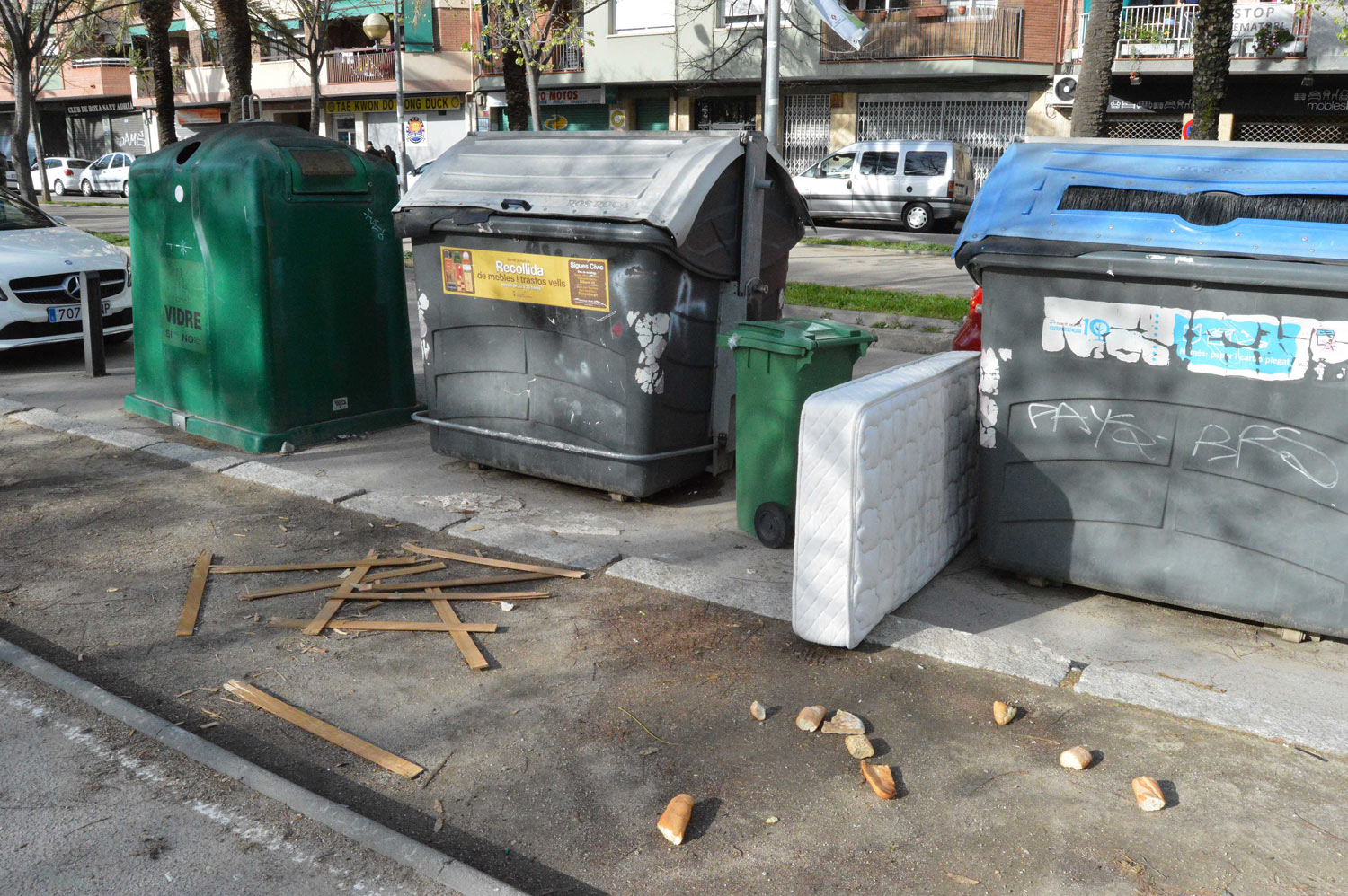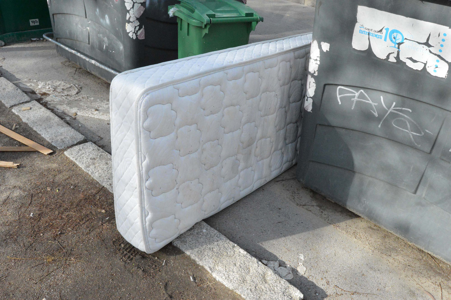 Las fotografías de esta entrada las tomé hace un par de meses. Pasaba por San Adrián de Besós, población colindante con Barcelona, y me encontré con la situación que se puede ver en la imagen número 1. Entre los contenedores había un colchón y sobre el suelo las lamas de un somier que había sido desmontado para aprovechar su estructura metálica. Entonces me paré a observar. Me acerqué a ver las lamas y vi que había todos los ingredientes de una infestación de chinches de cama: marcas de excrementos, huevos, mudas, ninfas y adultos. Luego observé el colchón. Había marcas de excrementos y algunas ninfas y adultos.