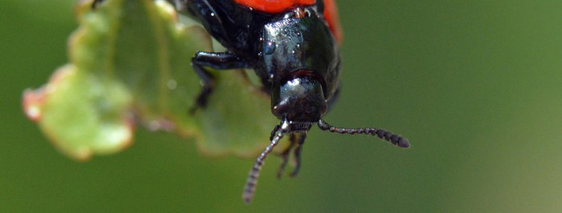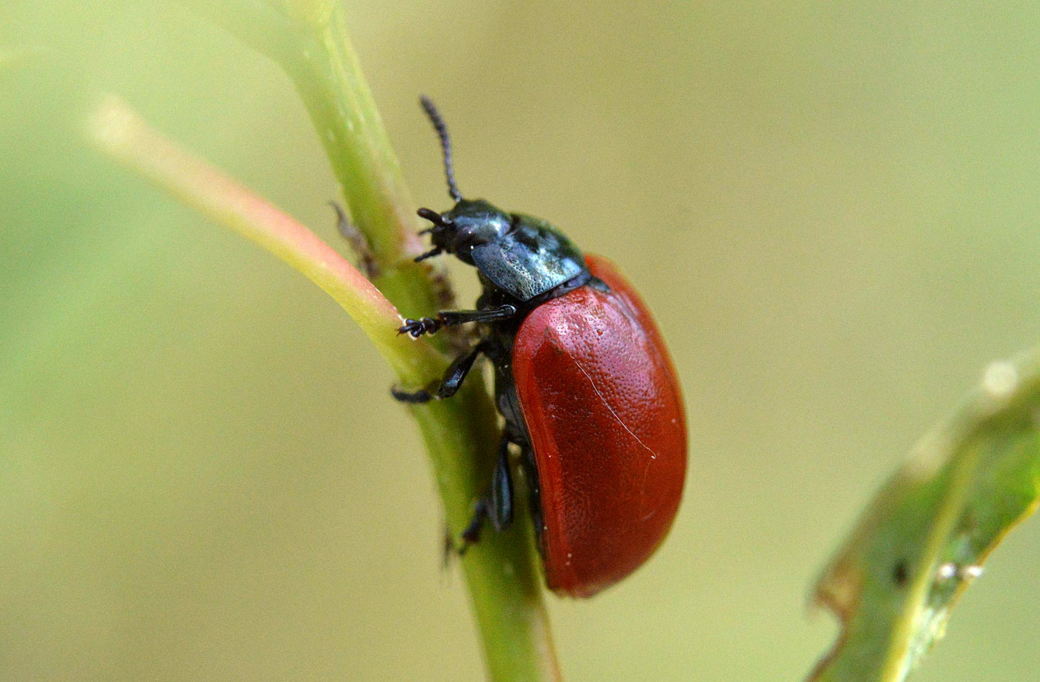 Los élitros de color rojo chillón delatan a este crisomélido (Chrysomelidae) conocido como escarabajo rojo del chopo (Chrysomela populi). Se lo puede ver sobre chopos y sauces donde desarrolla su ciclo biológico. Tanto la larva como el adulto se alimenta de las hojas del chopo. La larva se alimenta de la parte inferior de la hoja, mientras que el adulto de toda ella a excepción de las nervaduras principales.