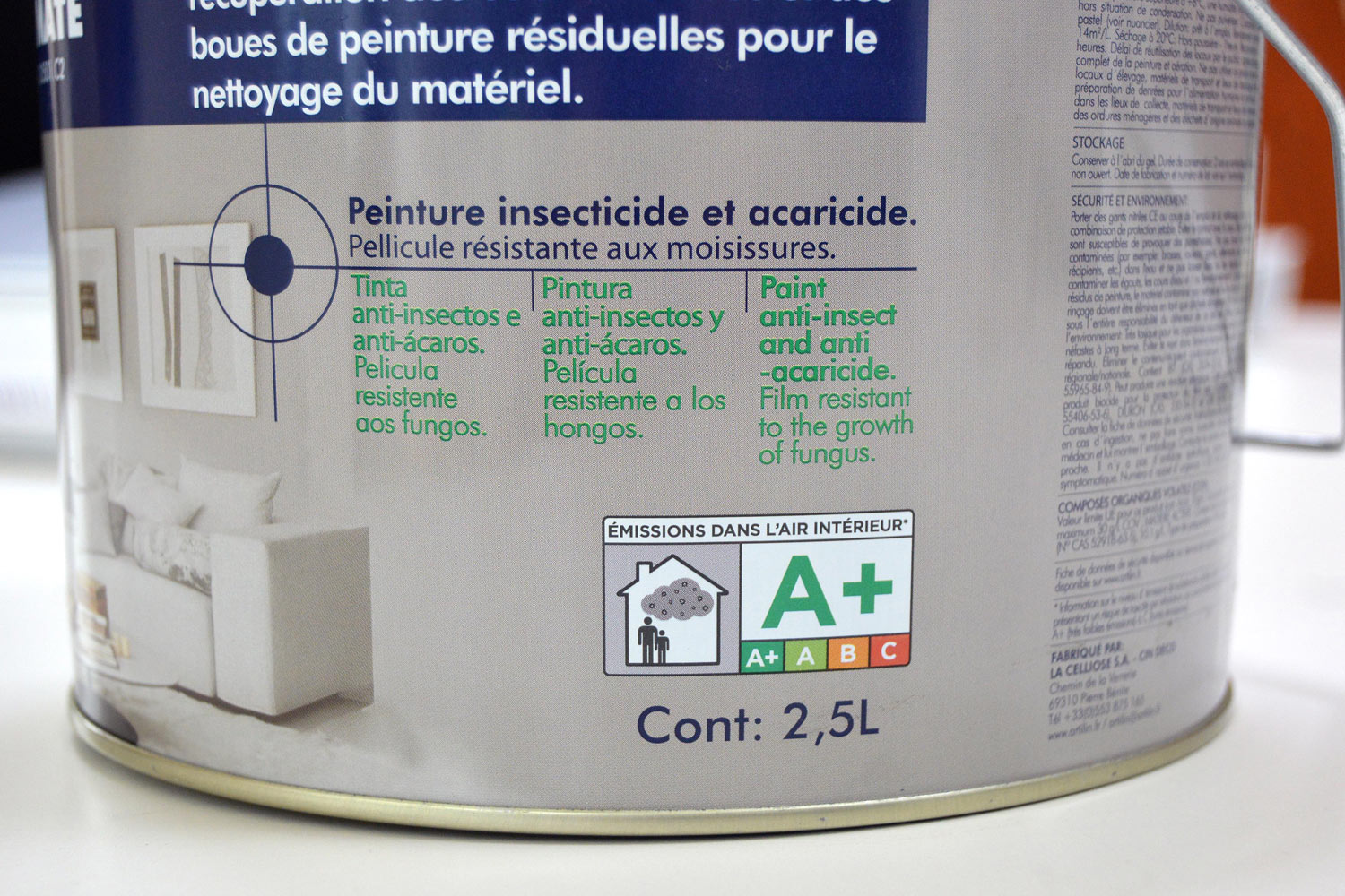 Frente a esta pintura insecticia, aparece 3A Mate que cuenta con una materia activa insecticida (deltametrina al 0’74%) y no está microencapsulada. Este hecho podría hacer pensar que es una desventaja, pero es todo lo contrario. Veamos. En primer lugar, porque 3A Mate es un producto que ha sido diseñado para ser utilizado en interiores contra ácaros, moscas y mosquitos. Es decir, es un producto bien pensado y dirigido. Y en segundo lugar, porque el uso de una pintura como Inesfly en interiores contra estos artrópodos sería excesivo y hasta peligroso en determinados ambientes. De hecho, 3A Mate es un producto que cuenta con la certificación A+ respecto a la calidad de aire interior (CAI). En Francia, a diferencia de lo que ocurre en España, cuentan con un sello para clasificar los productos y materiales de construcción que son utilizados en interiores. Y si un producto cuenta con la certificación A+, significa que no tiene emisiones que contaminen el aire que respiran las personas. Si tenemos en cuenta que la mayor parte de nuestras vidas las pasamos en interiores, se hace muy interesante contar con una clasificación de este tipo. Y más en un producto biocida.
